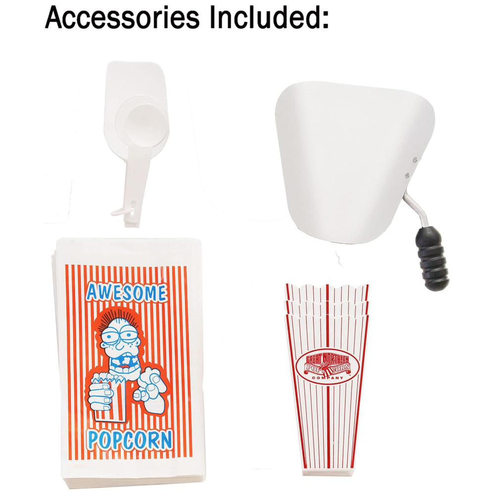 O produto inclui 3 copos de plástico, 25 sacos de pipoca e colher de copos medidores. A máquina de 640 W é aprovada pela ETL e funciona em 110V.
