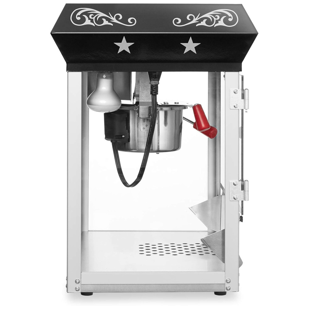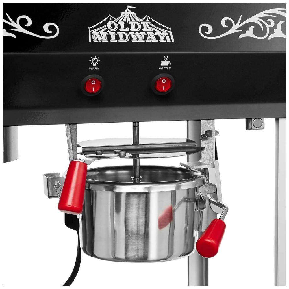 A operação conveniente com 2 interruptores inclui um aquecedor de foco, um agitador e um aquecedor de panela. A máquina inclui uma plataforma de aquecimento e luz de aquecimento para manter a pipoca fresca e deliciosa, bem como uma gaveta para coletar os grãos não estourados para um lote perfeito sempre. A limpeza é fácil com água e o cabo de alimentação padrão dos EUA de 120 volts permite configuração rápida e fácil em praticamente qualquer lugar.