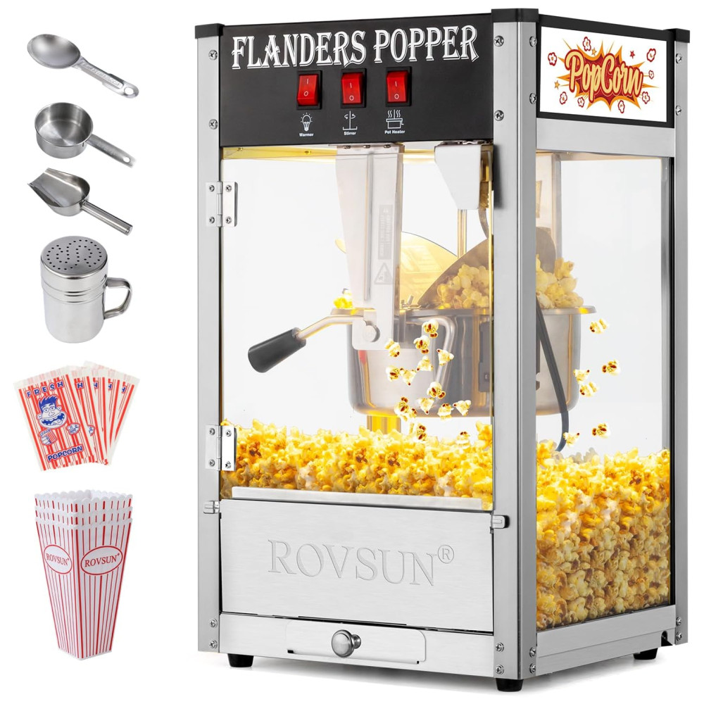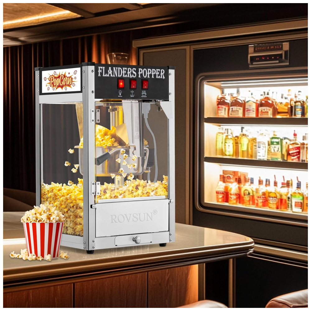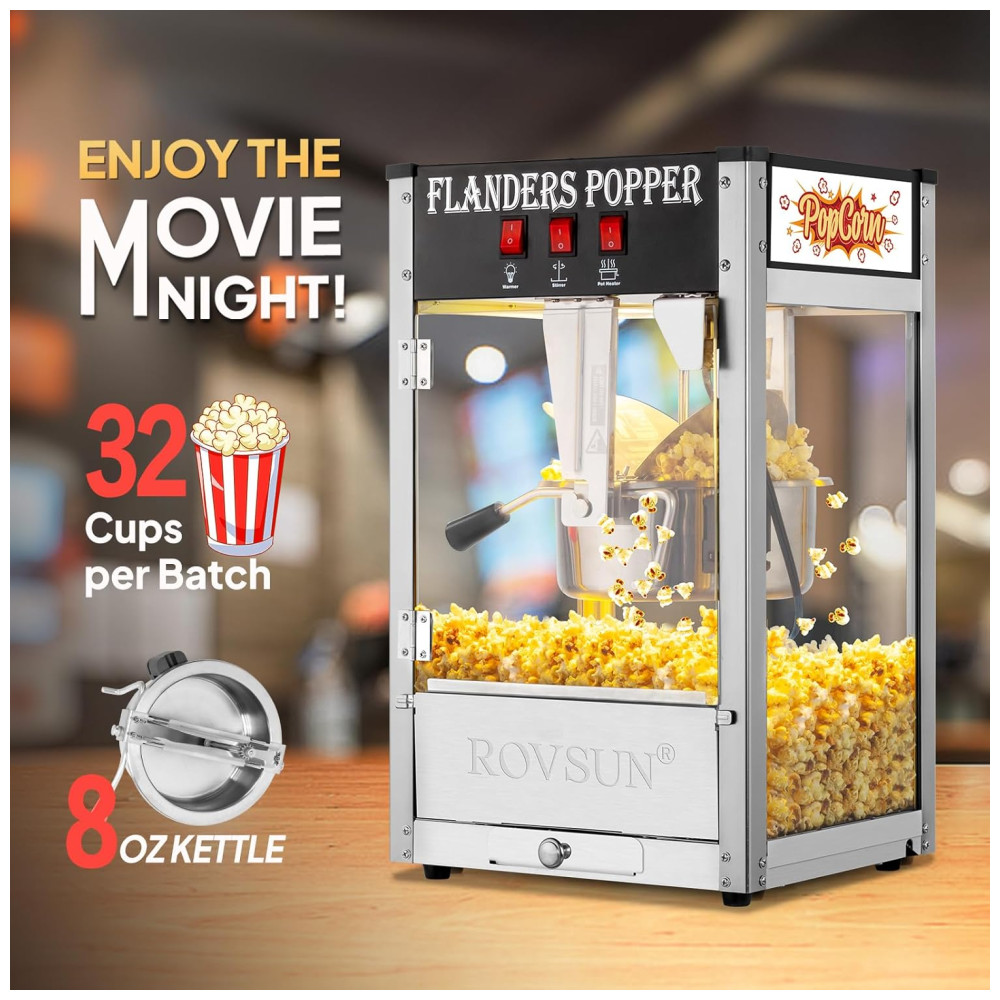 A chaleira de 226g pode ser removida após o uso para facilitar a limpeza. A máquina pode fazer até 32 xícaras de pipoca por lote e vem com acessórios, incluindo 1 colher de pipoca, 1 colher medidora de óleo, 1 colher medidora de milho, 3 copos de pipoca e 1 shaker. É ideal para uso doméstico e comercial em cinema, home theater, festas, etc. Também é uma boa escolha como presente para familiares ou amigos.