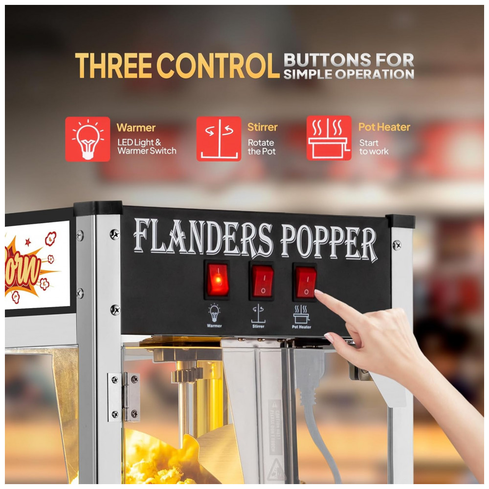 MATERIAL DE ALTA QUALIDADE A chaleira da máquina de pipoca é feita de aço inoxidável 304. Pipoca feita pela máquina estará segura para comer. E as portas são feitas de vidro temperado, o que garante a segurança durante a operação