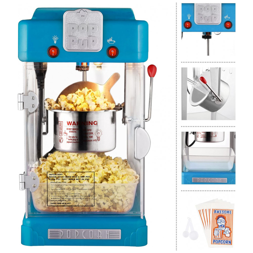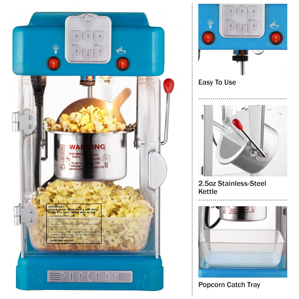 A máquina de canto pop de home theater apresenta uma chaleira de aço inoxidável de 73 mL que produz cerca de 4 quartos de pipoca em minutos. Traz a sensação e o cheiro de uma noite no cinema diretamente para sua própria casa.