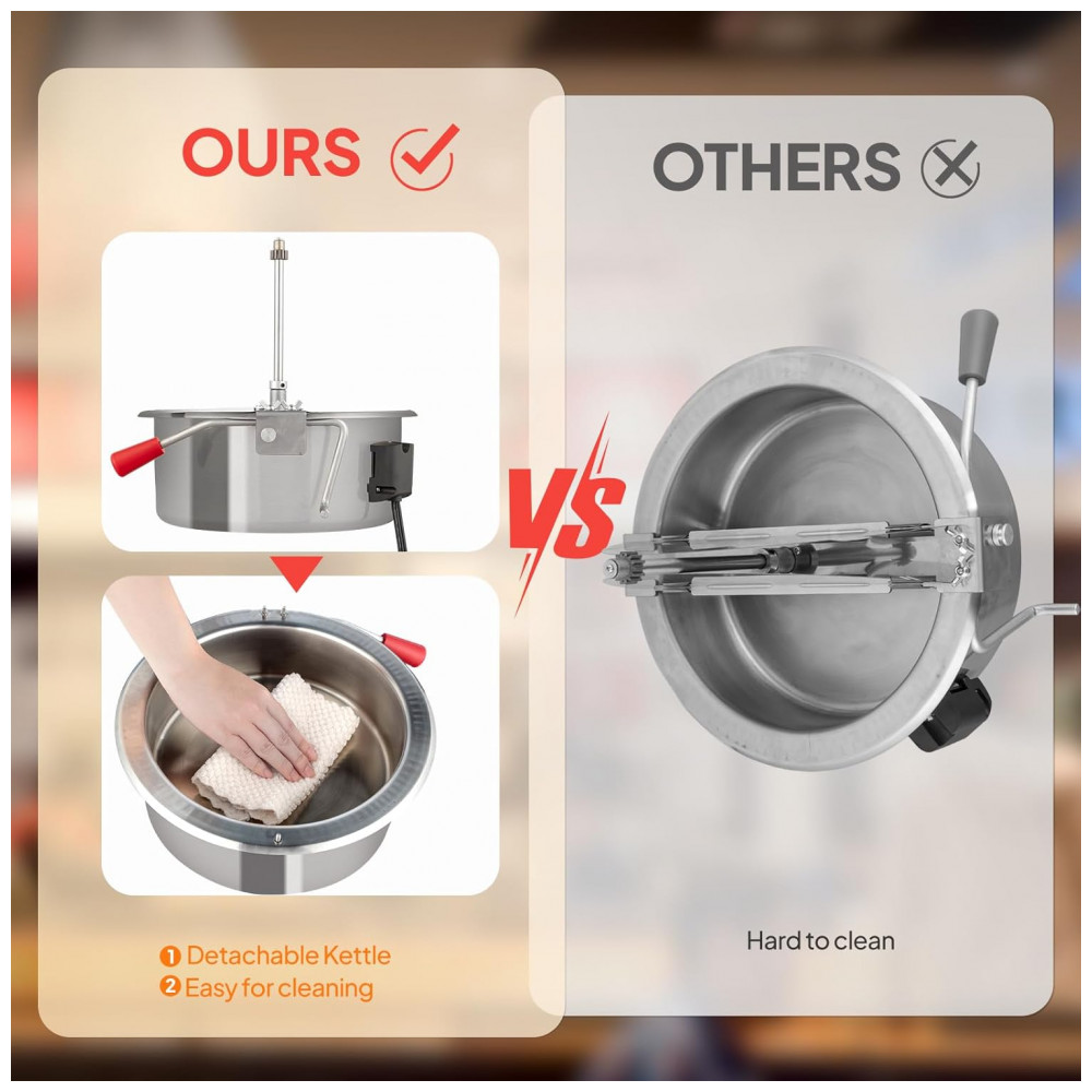 MATERIAL DE ALTA QUALIDADE A chaleira da máquina de pipoca é feita de aço inoxidável 304. A pipoca feita pela máquina será segura para comer. E as portas são feitas de vidro temperado, o que garante a segurança durante a operação