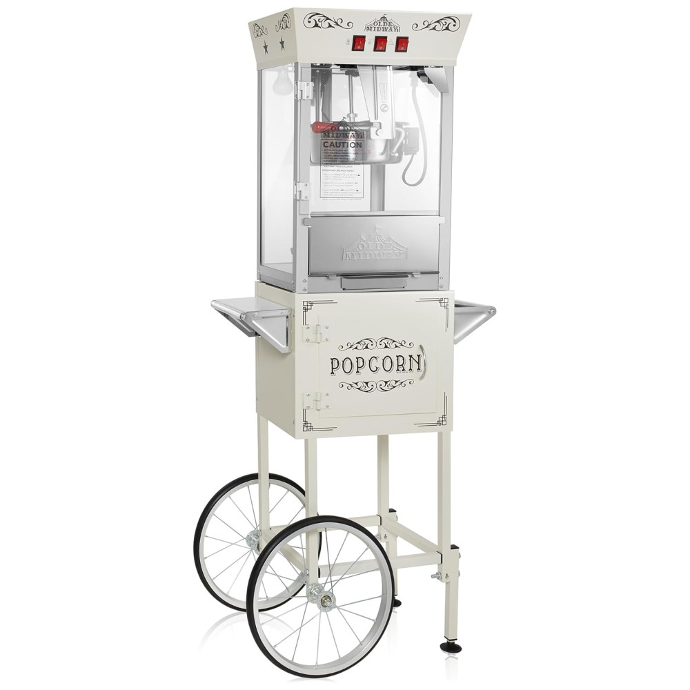 Máquina de pipoca com carrinho: a máquina de pipoca sobre rodas da Olde Midway apresenta um design em estilo antigo com características modernas. O carrinho de pipoca possui rodas estilo bicicleta de 40 cm e um armário com espaço para suprimentos de pipoca.
