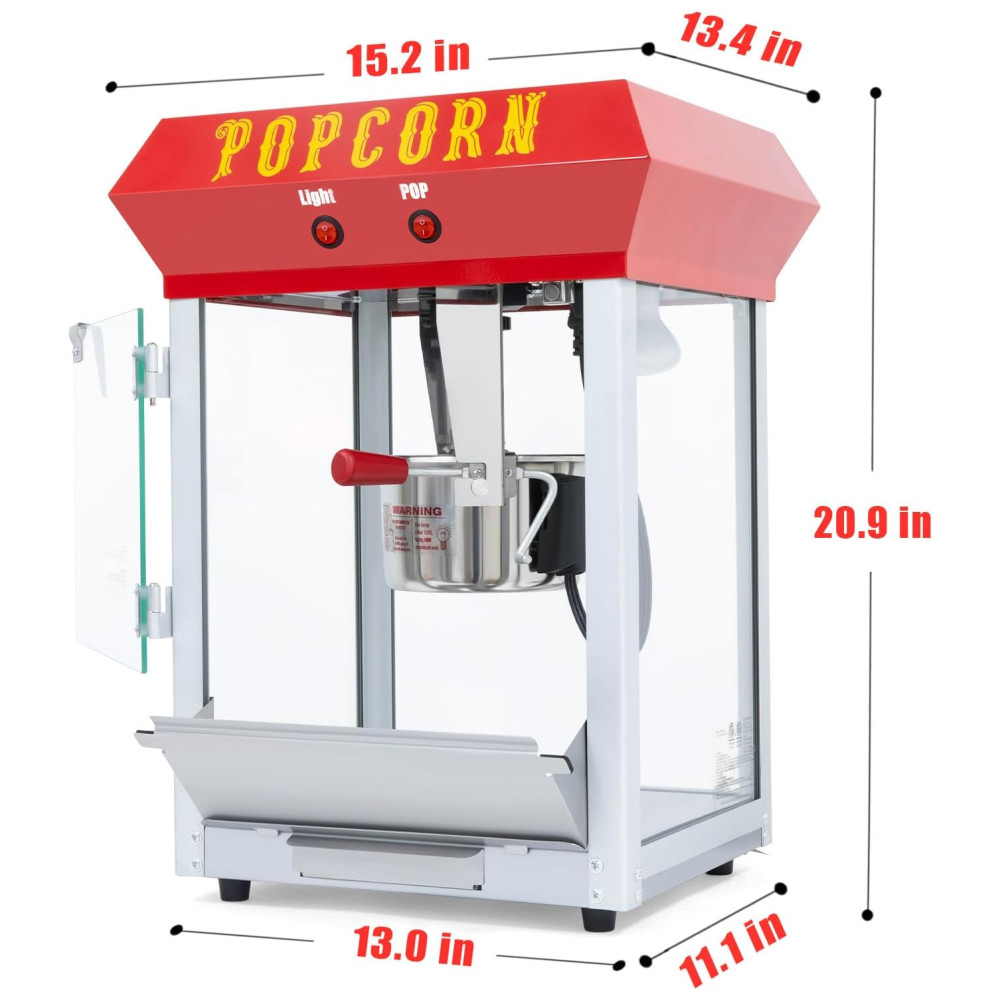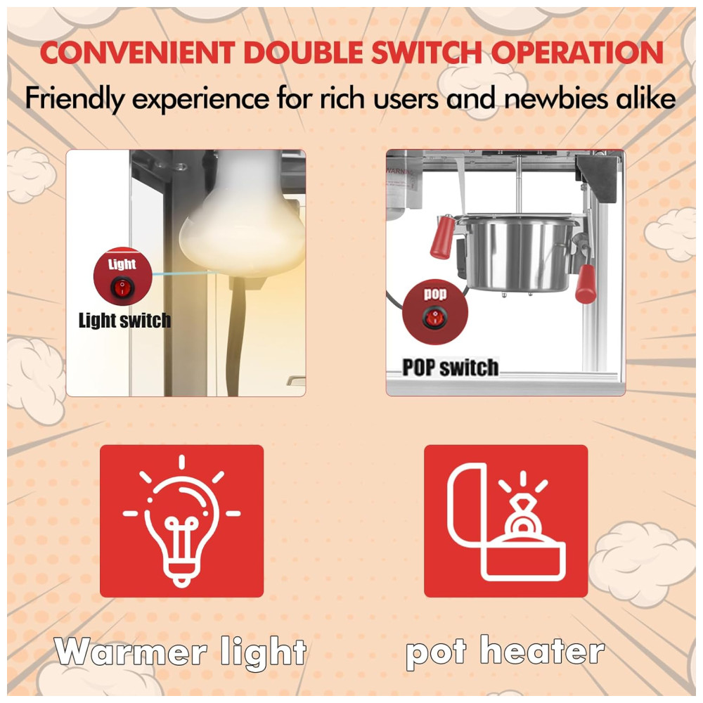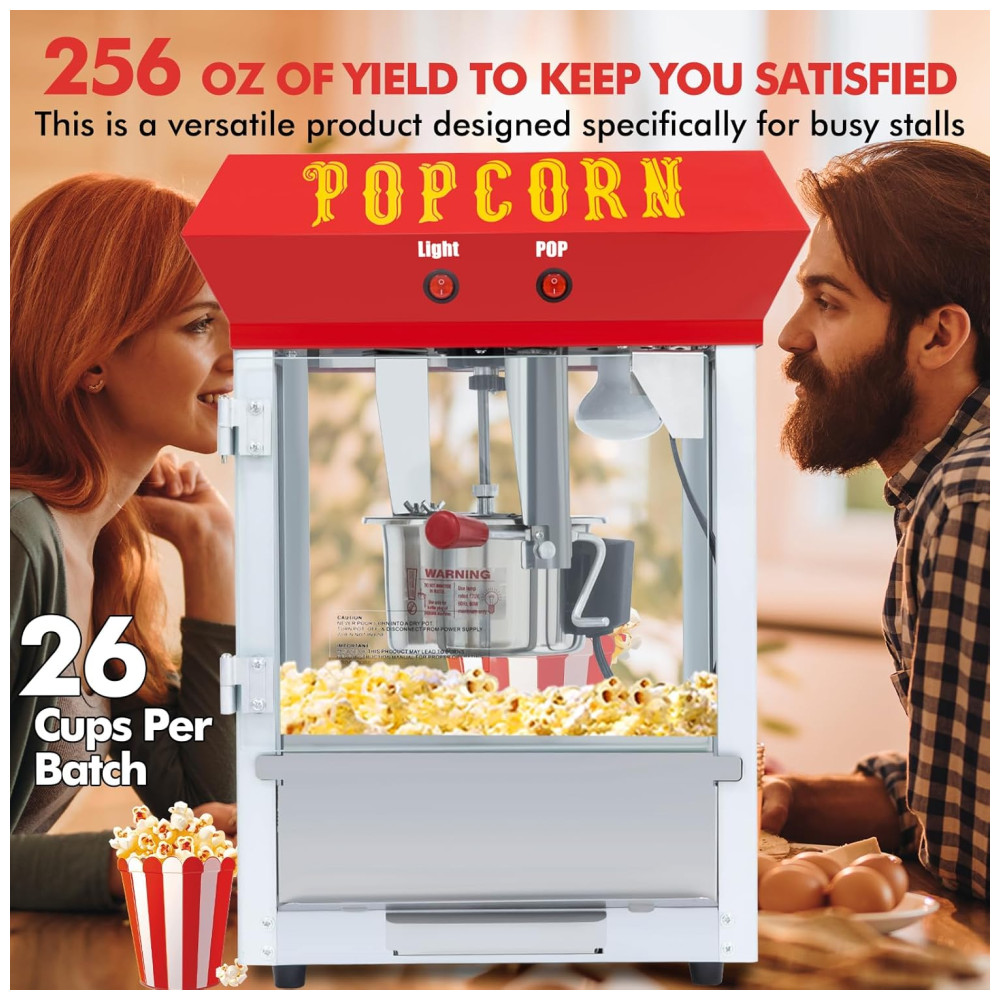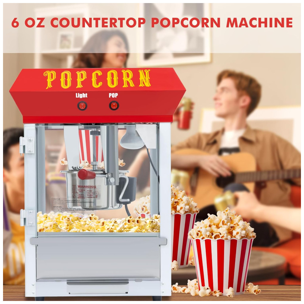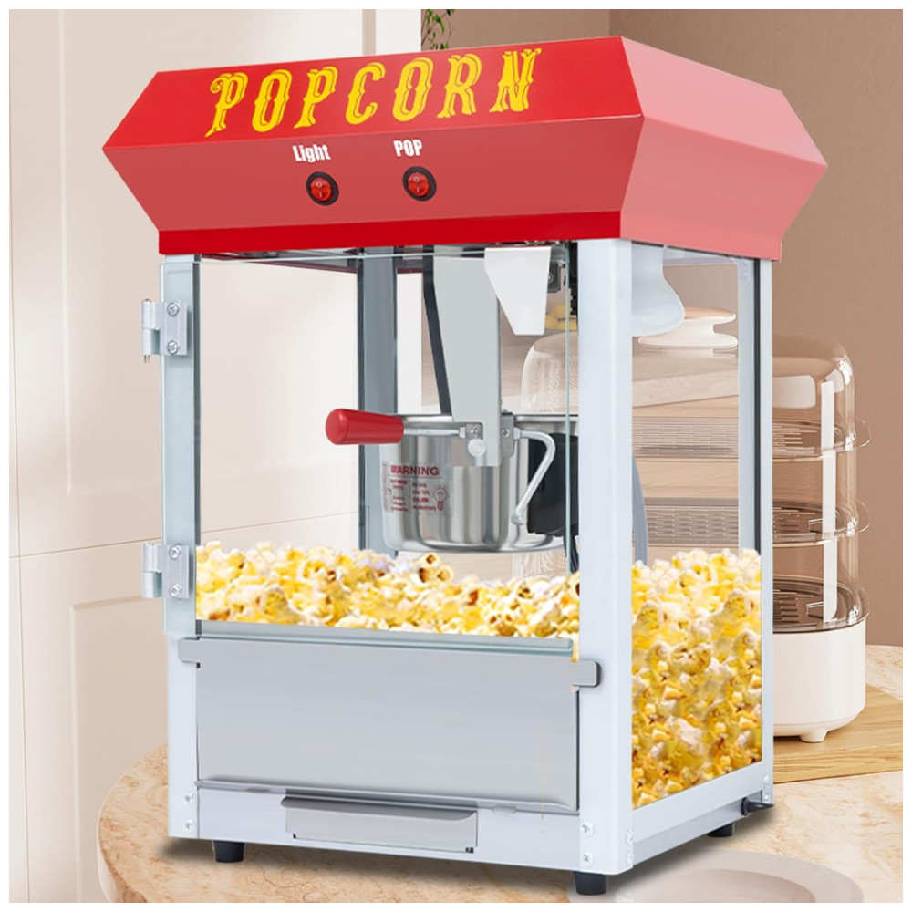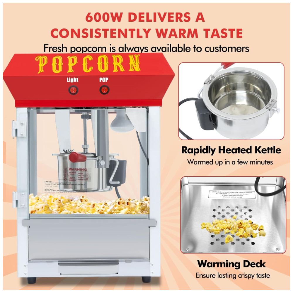 A Máquina de Pipoca é equipada com uma panela de aço inoxidável 600 watts de potência, capaz de produzir até 30 copos de pipoca por fornada. Ideal para noites de filmes em família, festas ou eventos pequenos. Esta máquina de pipoca combina charme vintage com melhorias modernas para durabilidade de longa duração. Possui um design conveniente com 2 interruptores para controle rápido e fácil do processo de pipoca. Mantém a pipoca quente e fresca, garantindo que cada fornada seja perfeitamente estourada e pronta para comer. Acompanha conjunto de acessórios em aço inoxidável que inclui xícara medidora de 12 copos, colher, pegador de pipoca e saleiro. Fácil de usar, limpar e manter. Com vidro temperado seguro e durável, garantindo proteção e resistência excepcionais contra arranhões e deformações.
