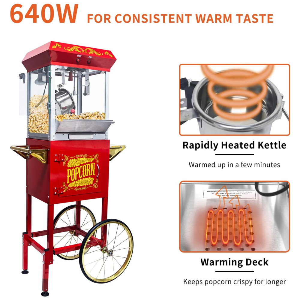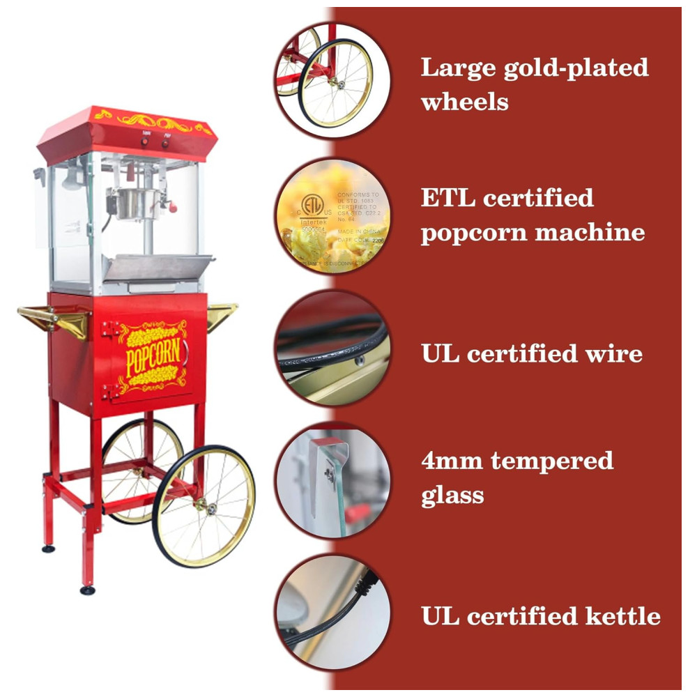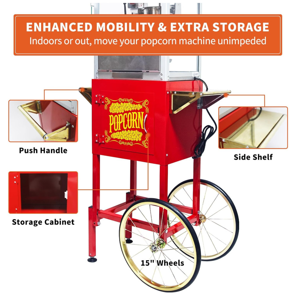 Pipoqueira Máquina de Pipoca com Rodas e Caldeira de Aço Inoxidável Estilo Vintage de Cinema para Festa em Casa – VermelhoJaxenor