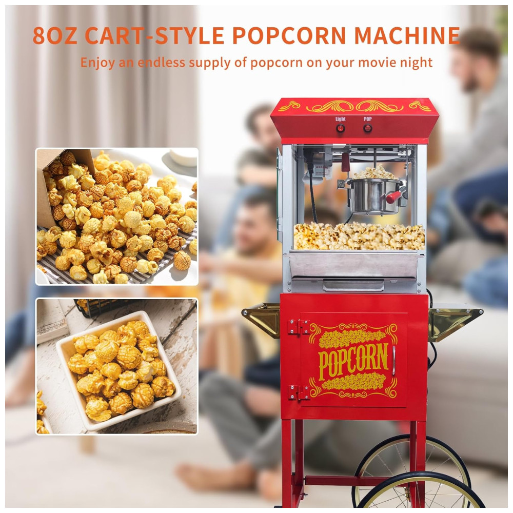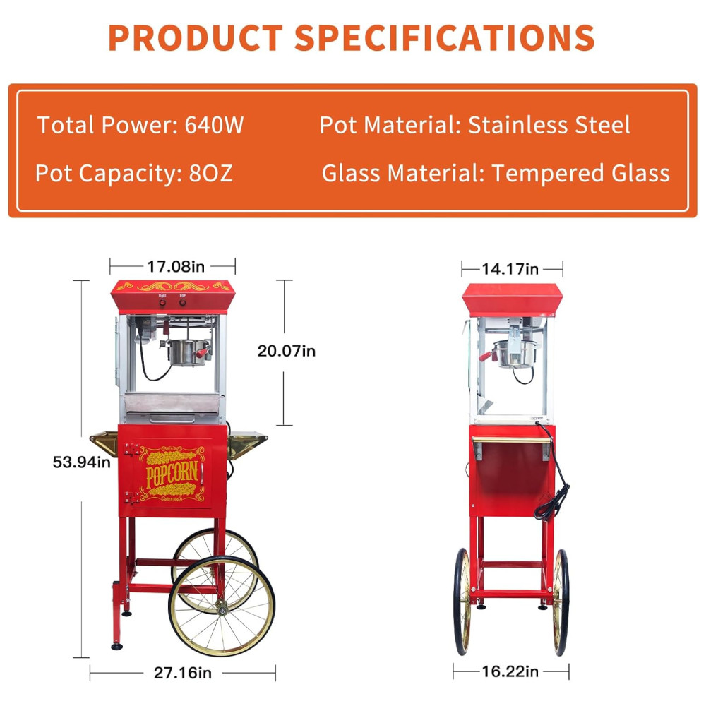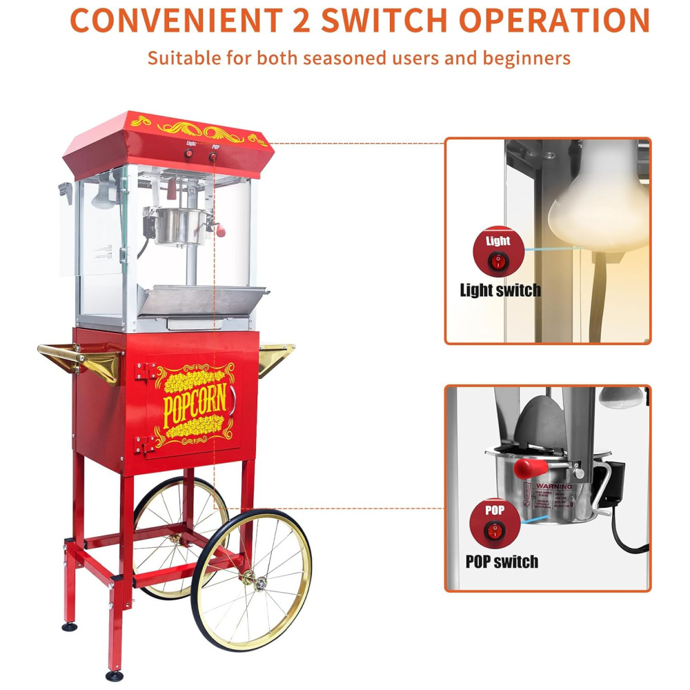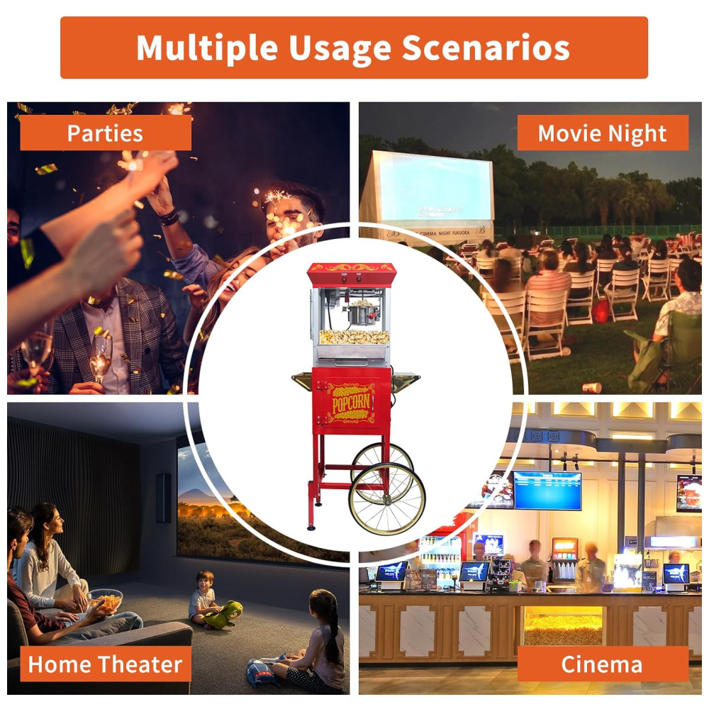 Pipoqueira Máquina de Pipoca com Rodas e Caldeira de Aço Inoxidável Estilo Vintage de Cinema para Festa em Casa – VermelhoJaxenor