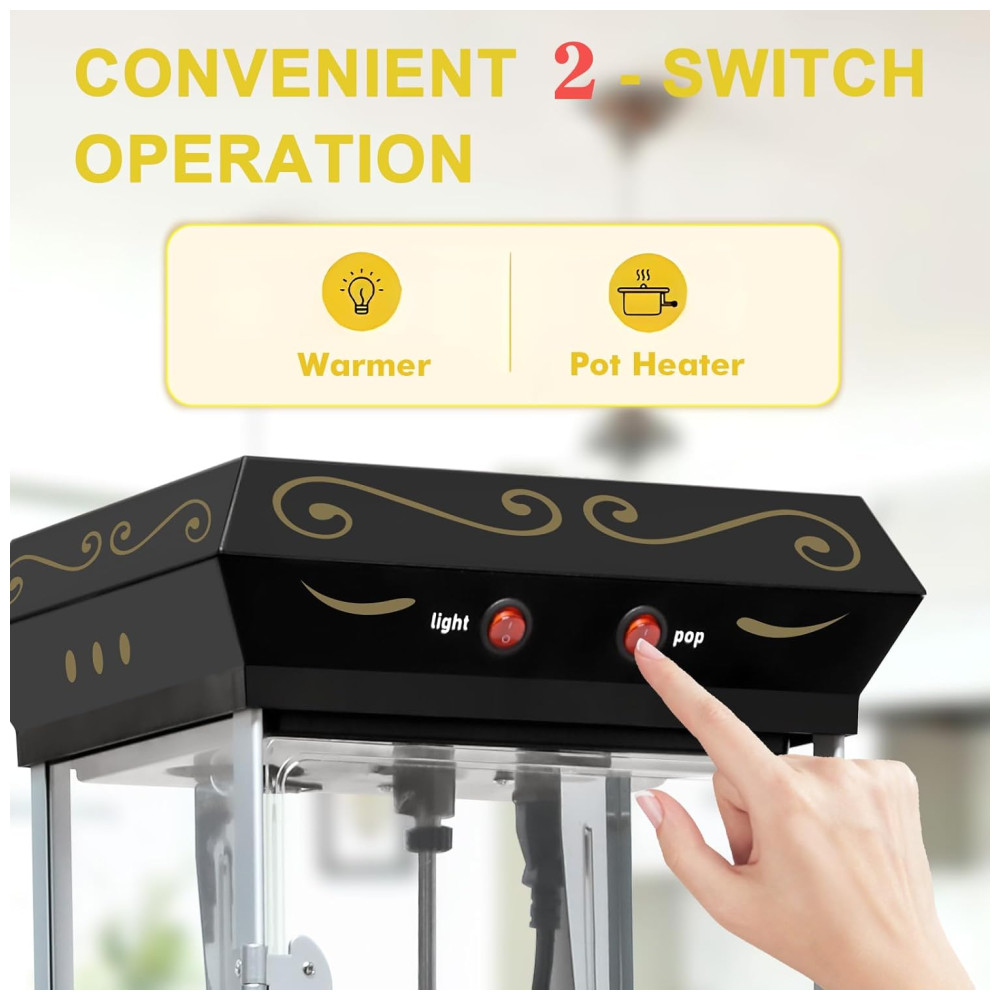 A Máquina de Pipoca da WIILAYOK traz a magia do cinema para a sua casa, com um equipamento potente e com estilo de cinema, projetado tanto para uso doméstico quanto comercial. Com seu acabamento vibrante, charme retrô e desempenho de nível profissional, esta máquina de pipoca se destaca em qualquer festa, noite de filmes ou evento de concessão. Equipada com um potente caldeirão de aço inoxidável de 480W, essa máquina de pipoca produz pipocas quentes e fofinhas em minutos. A plataforma aquecida mantém suas pipocas quentes e frescas, enquanto a gaveta coletora de grãos não estourados facilita a limpeza. Com controles amigáveis, dois interruptores independentes controlam o aquecedor da luz e o aquecedor da panela mexedora. Seja para uma noite de filmes em casa ou para um stand de concessão, esta máquina de pipoca oferece operação suave e intuitiva. Montada em um carrinho clássico com rodas robustas, este fabricante de pipoca oferece excelente mobilidade e estabilidade. O design vintage do carrinho de pipoca vermelha adiciona uma vibração nostálgica a qualquer ambiente. Ideal para eventos temáticos, noites de filmes em família ou para atrair atenção em feiras e eventos comunitários. Além disso, acompanha tudo o que você precisa para começar: 3 copos de plástico, colheres medidoras e uma pá de pipoca. Com montagem mínima necessária, você está a apenas alguns minutos de servir pipocas frescas e deliciosas.