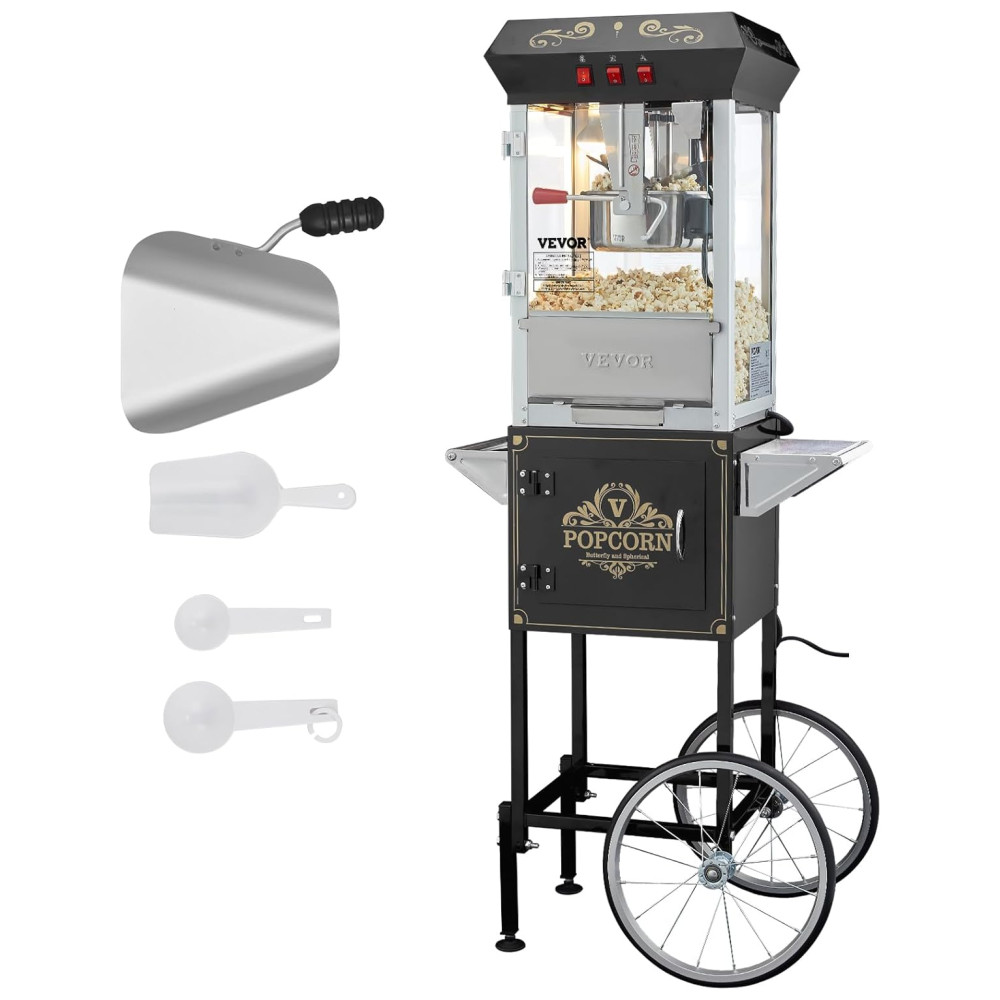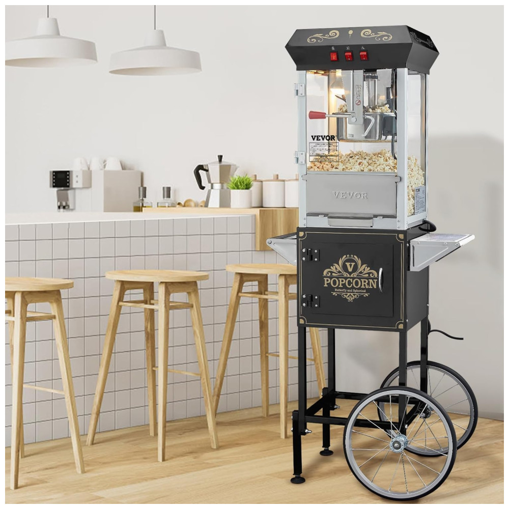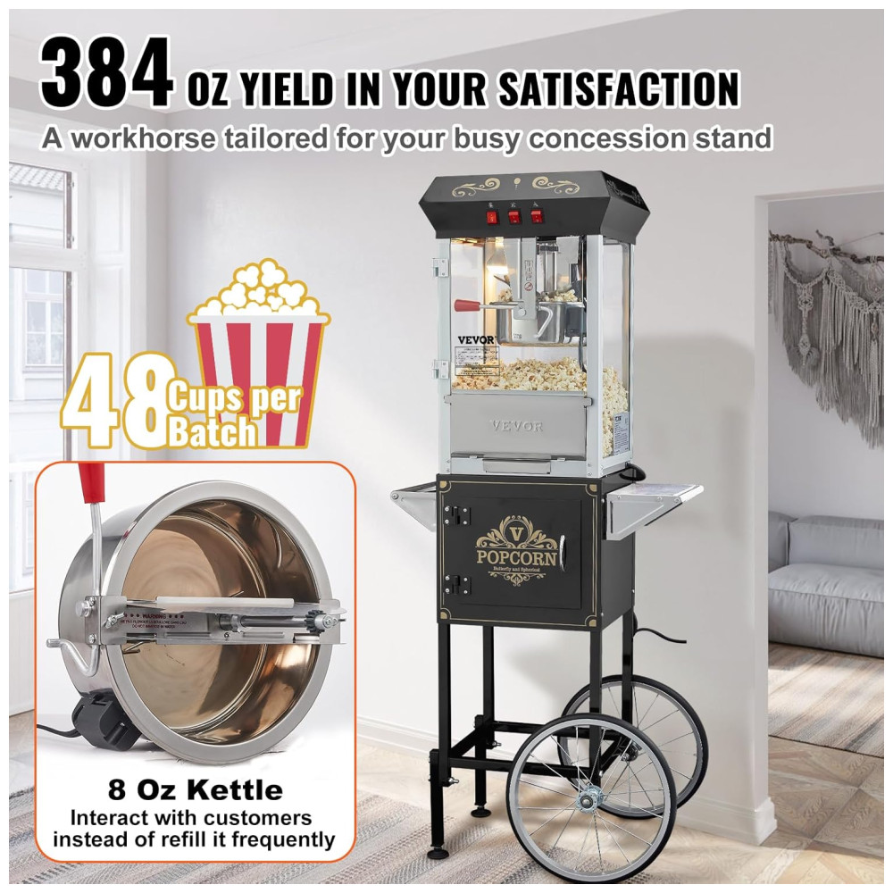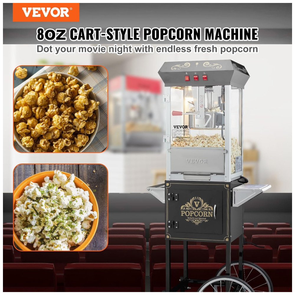 Pipoqueira VEVOR com Carrinho 850W 8 Oz Faz 48 Copos Vidro Temperado 4 Colheres Medidoras