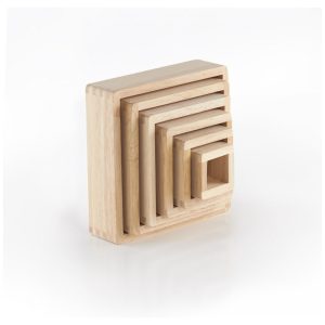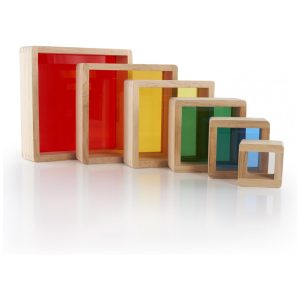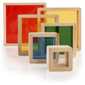 Conteúdo da caixa: 6 blocos quadrados em madeira com janelas acrílicas coloridas em tamanhos graduados