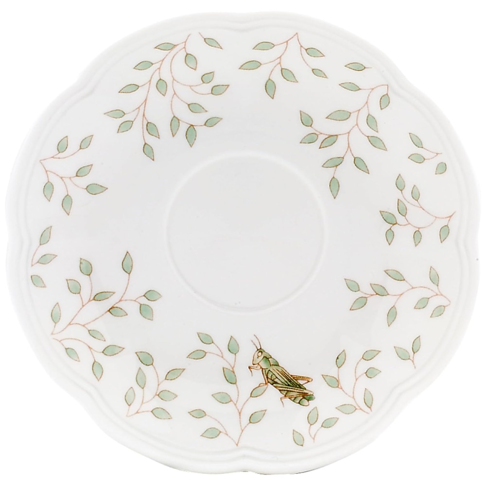 O pires Lenox Butterfly Meadow, com 15 cm de diâmetro, é feito de porcelana de osso fino e complementa perfeitamente qualquer refeição, seja almoço, jantar ou sobremesa. A arte do pires, inspirada no popular padrão Butterfly Meadow, traz um design simples, mas distinto, com pequenas folhas em um verde suave ao redor da borda e um encantador gafanhoto.