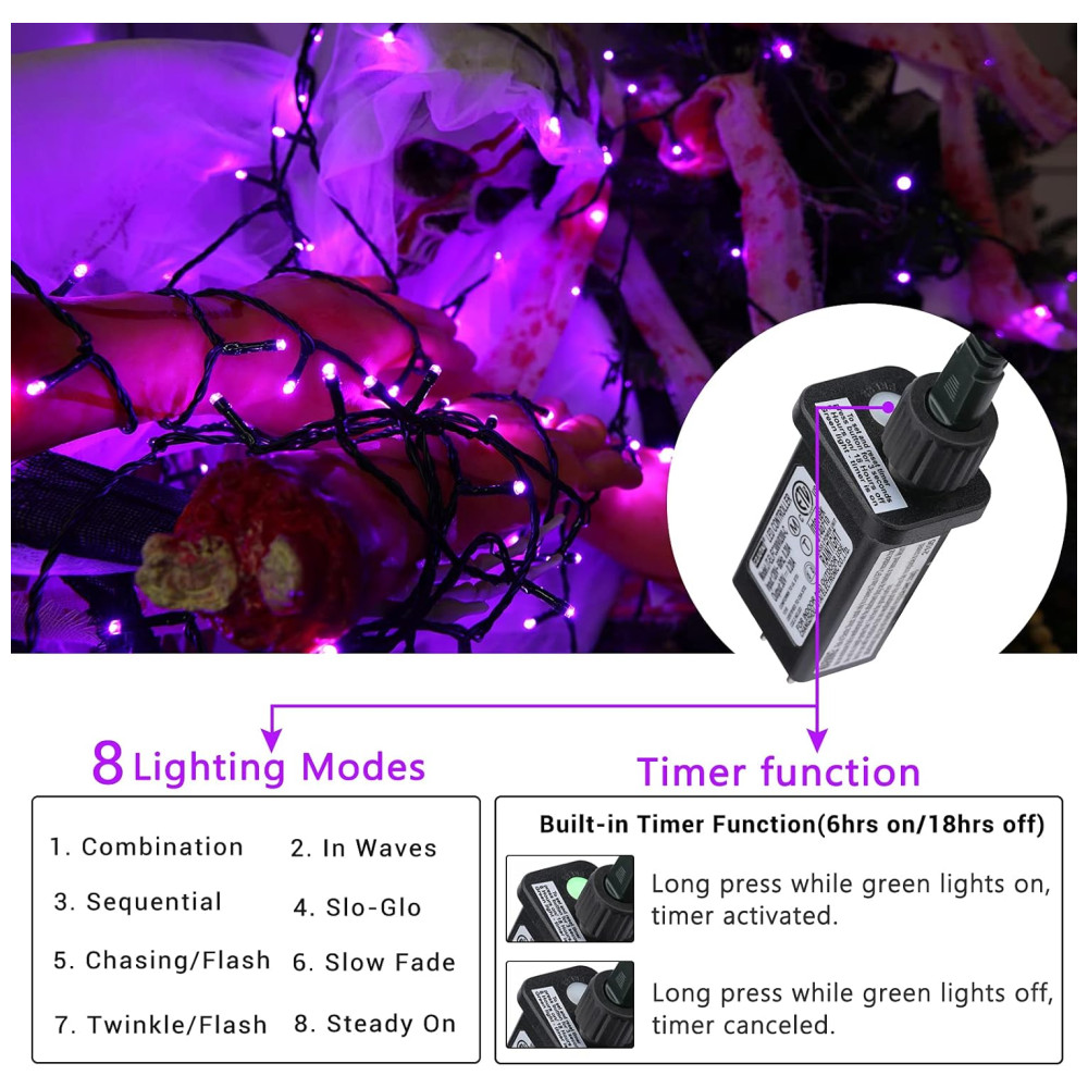 8 modos de iluminação e temporizador automático: essas luzes laranja do Halloween apresentam 8 modos de iluminação, basta pressionar o botão no adaptador para configurar seu programa de iluminação favorito. O temporizador embutido manterá as luzes do Dia das Bruxas ligadas por 6 horas e desligadas por 18 horas uma vez ativadas. Liberte suas mãos e economize energia. Nota: Pressione o botão por 3 segundos até acender uma luz verde, o temporizador será ativado