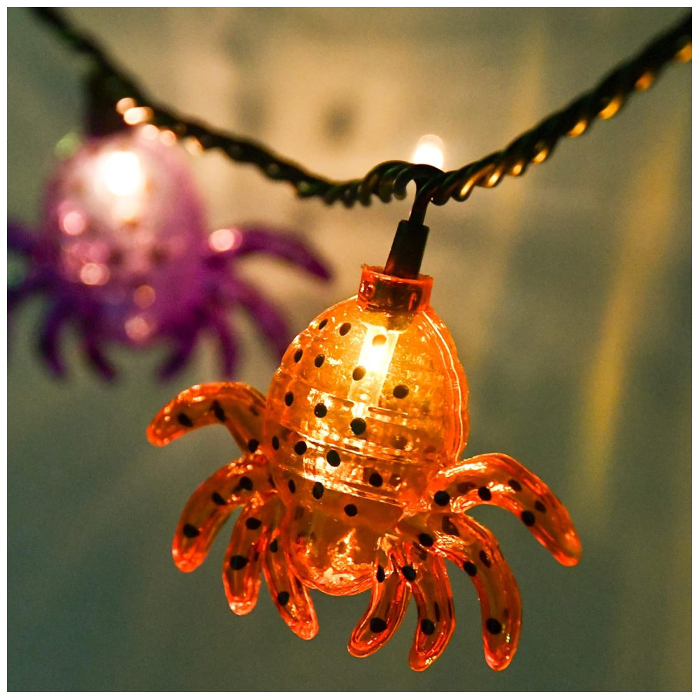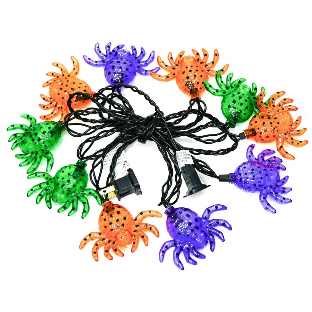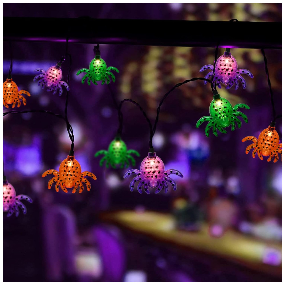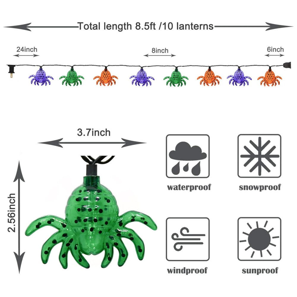 Luzes de cordas de Halloween ao ar livre: comprimento total da luz de corda de aranha de Halloween é de aproximadamente 259,08 centímetros com 10 luzes de aranha multicoloridas laranja, verde e roxo, 0,84W por lâmpada, 120V, e as luzes emitidas após a iluminação as fazem parecer assustadoras. Acrescenta uma cor estranha à sua festa de Halloween.