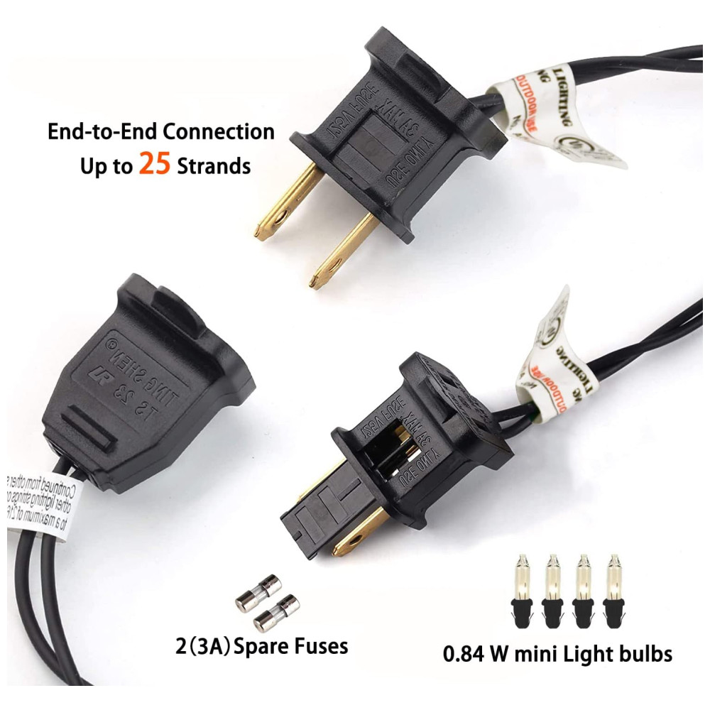 Luz de corda conectável do Halloween: as luzes de cordas fantasmas externas adotam o soquete de design de conexão de ponta a ponta. Possui um cabo de aproximadamente 60,96 centímetros com plugue macho, um espaçamento de aproximadamente 20,32 centímetros entre as lâmpadas e uma cauda de aproximadamente 15,24 centímetros com conector fêmea. Pode conectar no máximo 25 fios das mesmas luzes de corda de watts.
