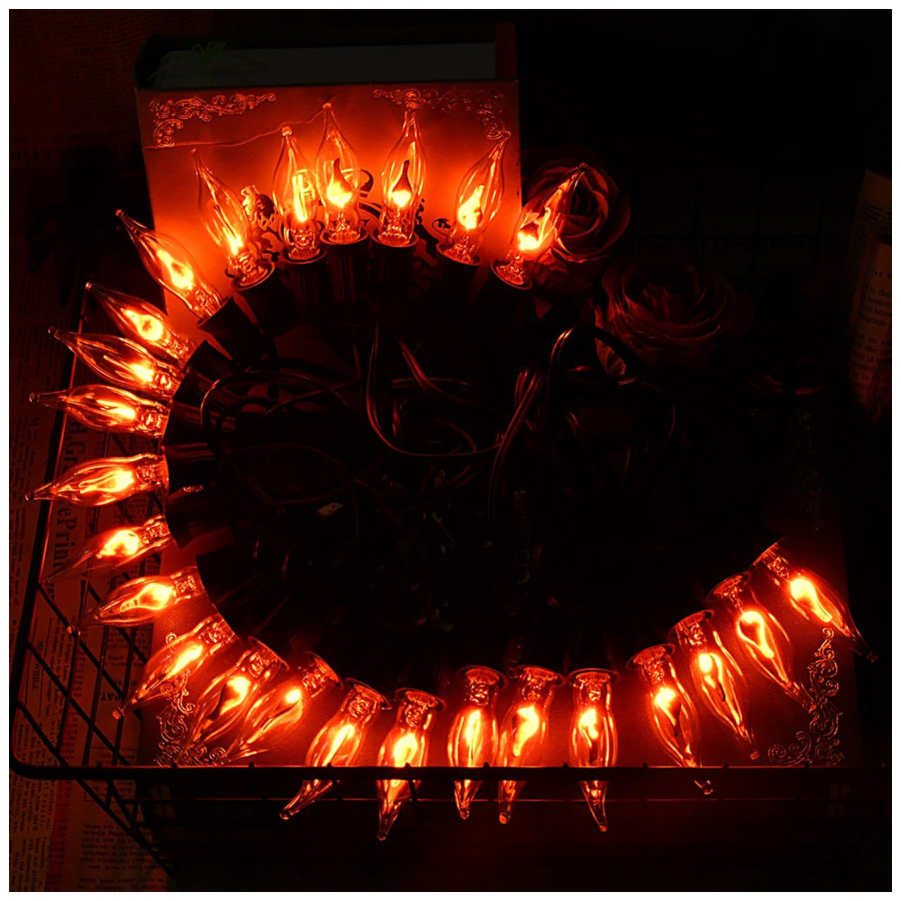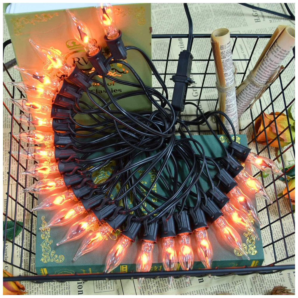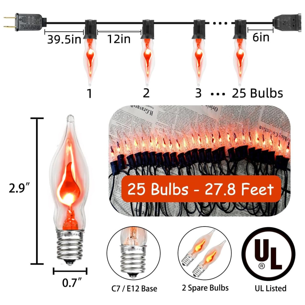 Parâmetros das Luzes de Chama: As luzes de chama têm um total de 843,6 centímetros com 25 lâmpadas de chama transparente e mais 2 lâmpadas sobressalentes para sua conveniência. Estendeu de forma inovadora o plugue macho para 39,5 centímetros, 1 metro, e espaçamento de 30,5 centímetros entre a lâmpada, 15,2 centímetros leva o plugue fêmea. Base de candelabro C7, E12, 1 Watt, 120 Volts, conecta até 432,2 centímetros de fios da mesma chama