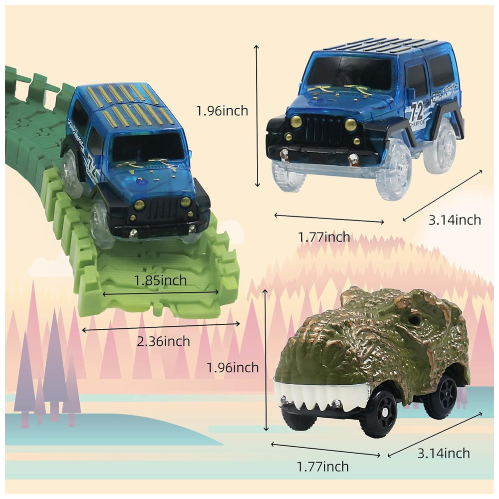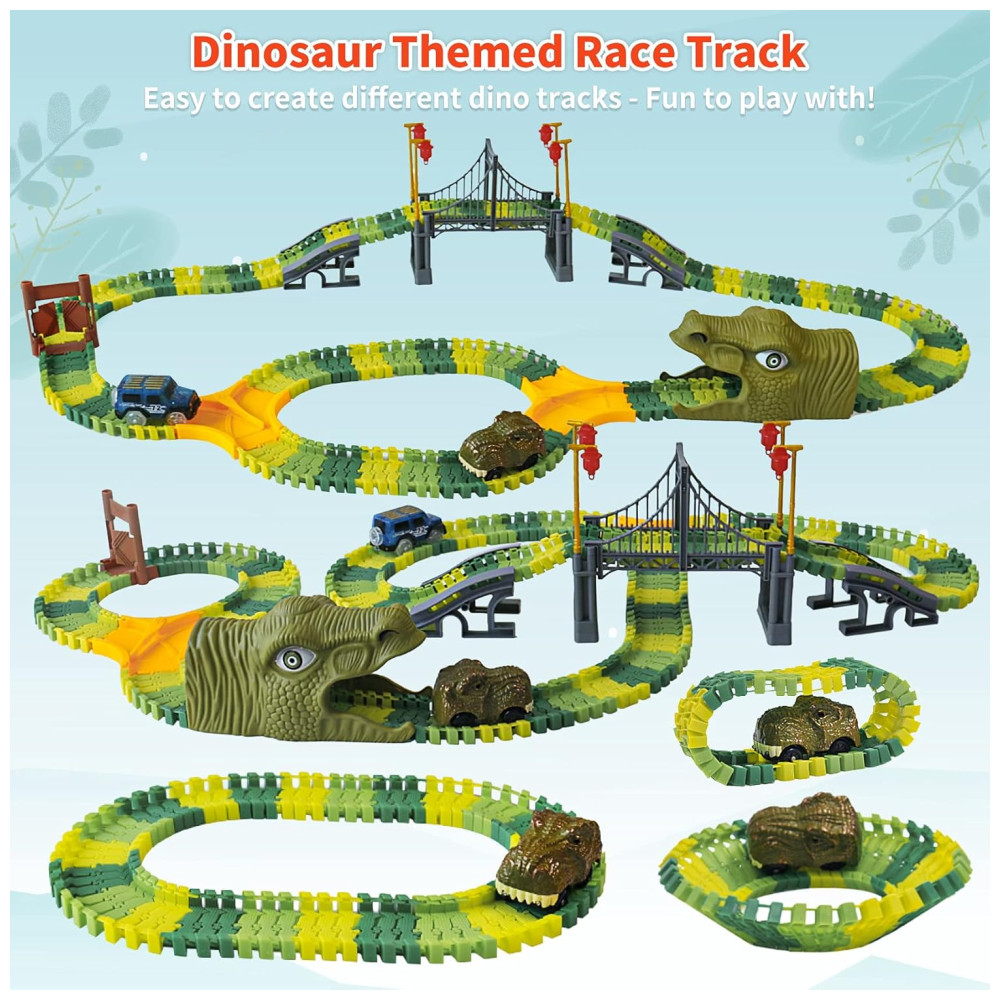A pista de corrida Dinosaur Road Race for Kids é perfeita para crianças a partir de 3 anos. Com um tema de dinossauro, inclui 216 pistas, 1 carro de corrida, 1 figura de dinossauro do carro e túnel, 8 dinossauros, 1 ponte, 2 pistas, 3 árvores, 2 junções tipo Y e 1 porta. As peças são fáceis de montar e desmontar em qualquer junta, permitindo que as crianças criem diferentes opções de pista sozinhas.