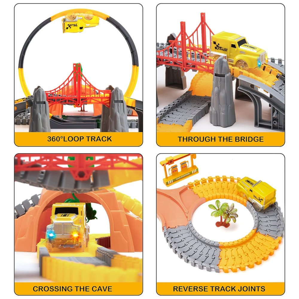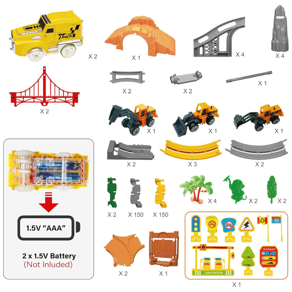 Este é o novo conjunto de pista de corrida de construção com 342 peças. O pacote inclui 300 x pistas de corrida flexíveis, 2 corridas de construção elétrica, 16 dispositivos de ponte, 9 x 360º pistas, 2 pistas reversas, 1 pista de porta, 3 veículos de engenharia e 9 sinais de trânsito.