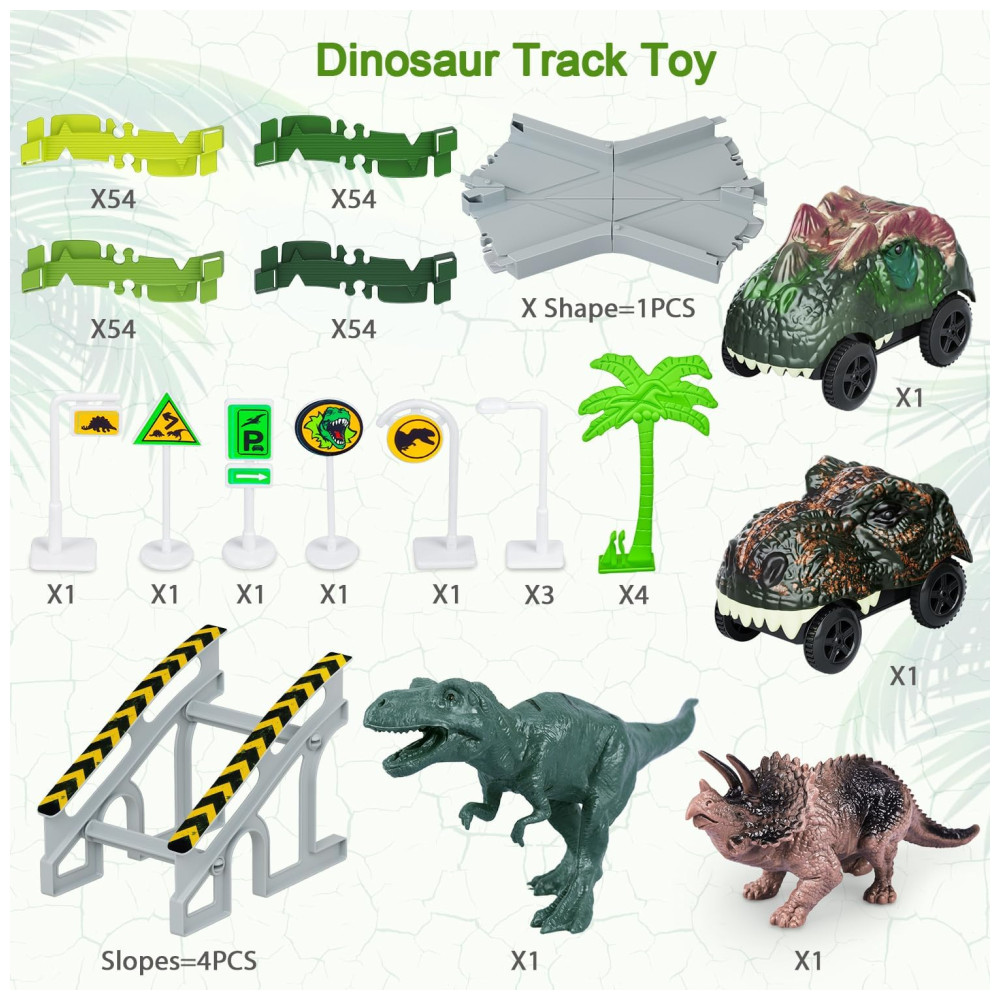 Esse Playset é composto por 216 peças de pista, 4 árvores, 2 dinossauros, 2 carros de dinossauro, 1 xshape, encruzilhada, 4 pistas e 8 sinais de trânsito. Com tema de dinossauro, é perfeito para criar trilhas exclusivas do mundo dos dinossauros. É um ótimo brinquedo de interação para meninos e meninas, fácil de montar ou desmontar para armazenar. As peças dos trilhos do trem são dinâmicas e podem girar para a esquerda ou para a direita, permitindo muita flexibilidade e criando um novo layout de trilho para diferentes variações. O carro de dinossauro requer bateria 1xAA NÃO INCLUÍDA, e o conjunto ainda inclui 2 carros de dinossauro e 2 moldes de dinossauro para tornar o jogo mais interessante e atraente. Além disso, este conjunto ajuda a aprender a cooperar e a exercitar a coordenação olho mão e a percepção de cores. É seguro, não tóxico, de alta qualidade e durável, além de não ser prejudicial para as crianças. Este conjunto de trilhos de trem com caixa de embalagem colorida é a melhor escolha para presente de aniversário infantil ou presente de Natal.