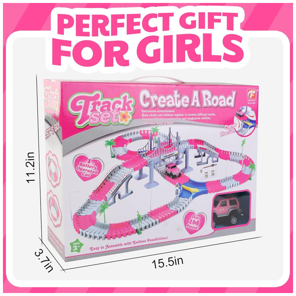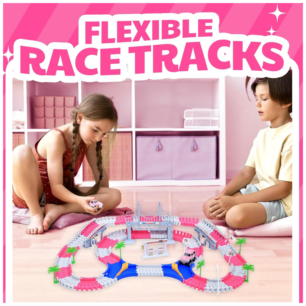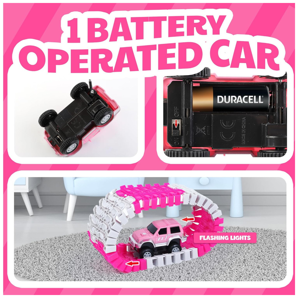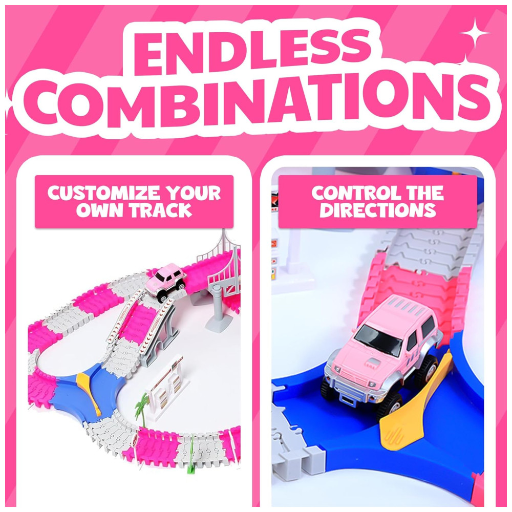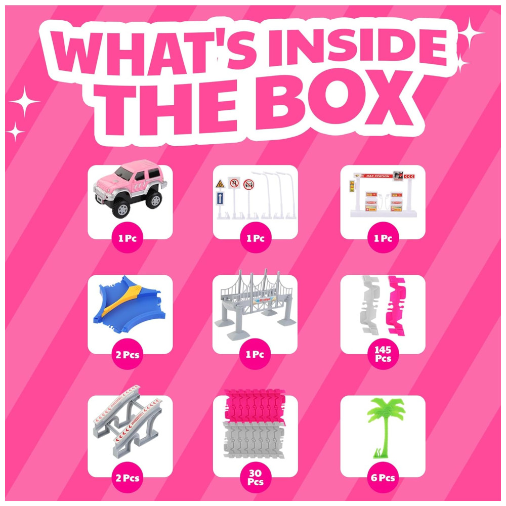 Crie uma pista de corrida personalizável com 168 peças que se encaixam facilmente, oferecendo designs de pistas infinitos e horas de diversão para bebês, crianças e meninas. O design rosa princesa encantará sua pequena, inspirando a criatividade e imaginação.