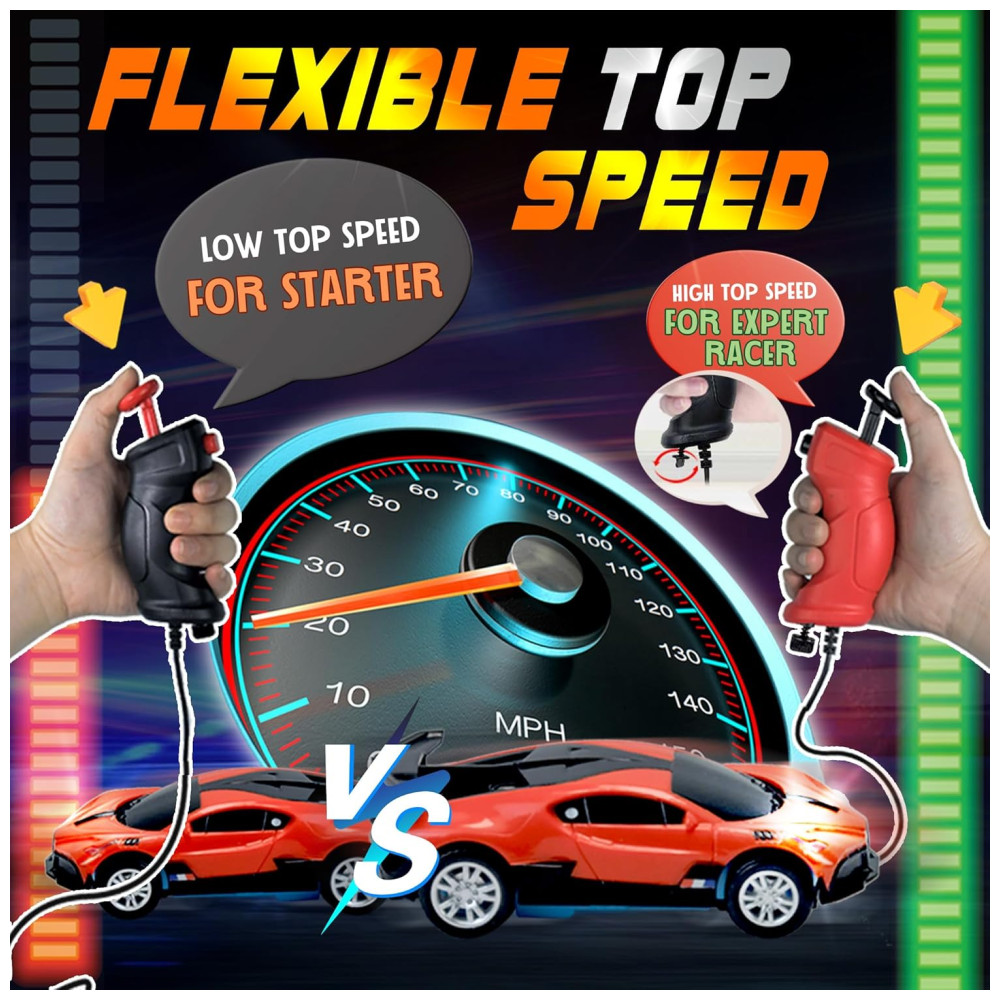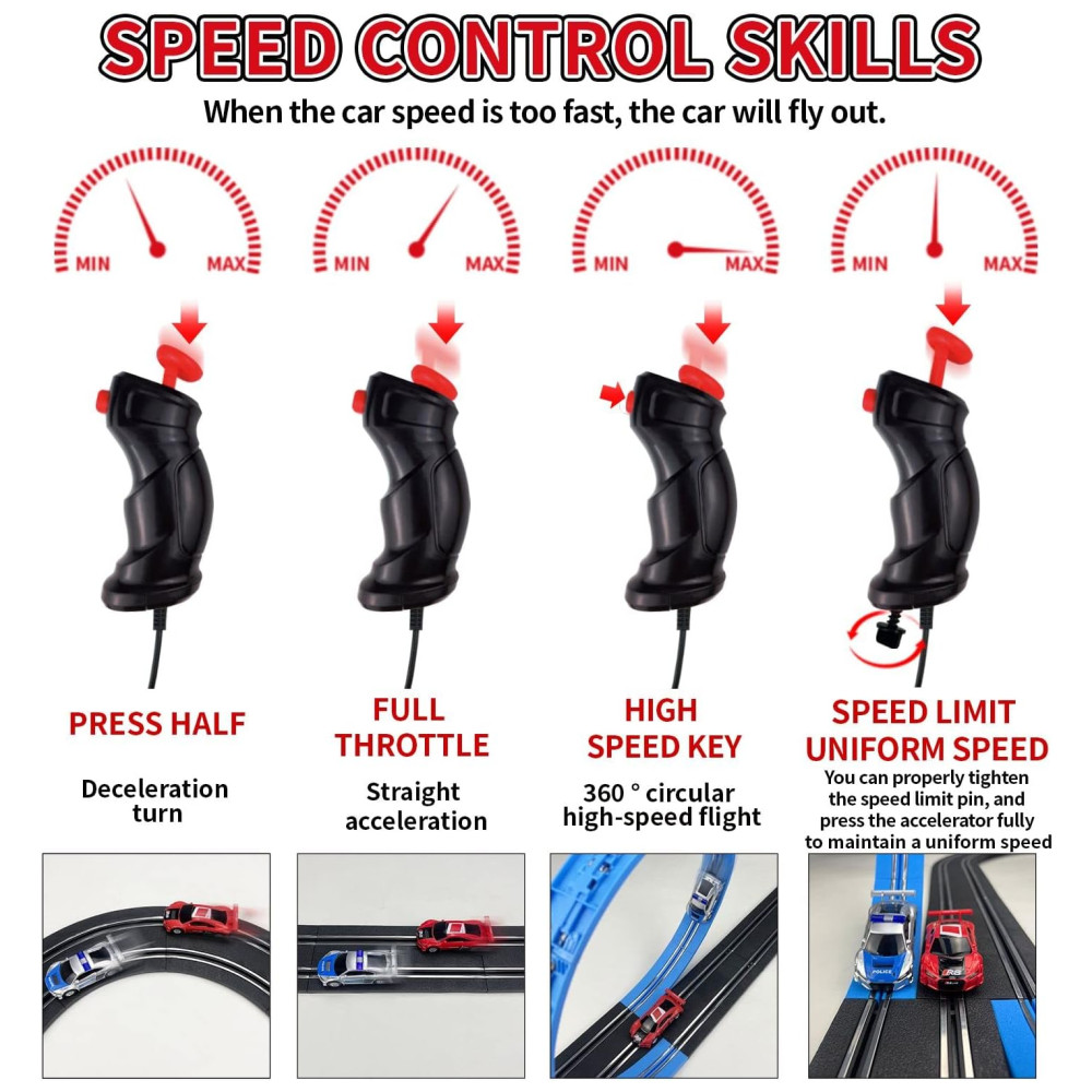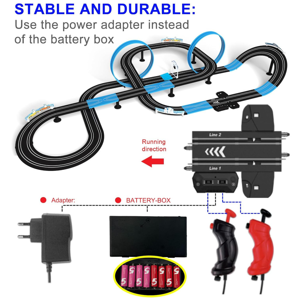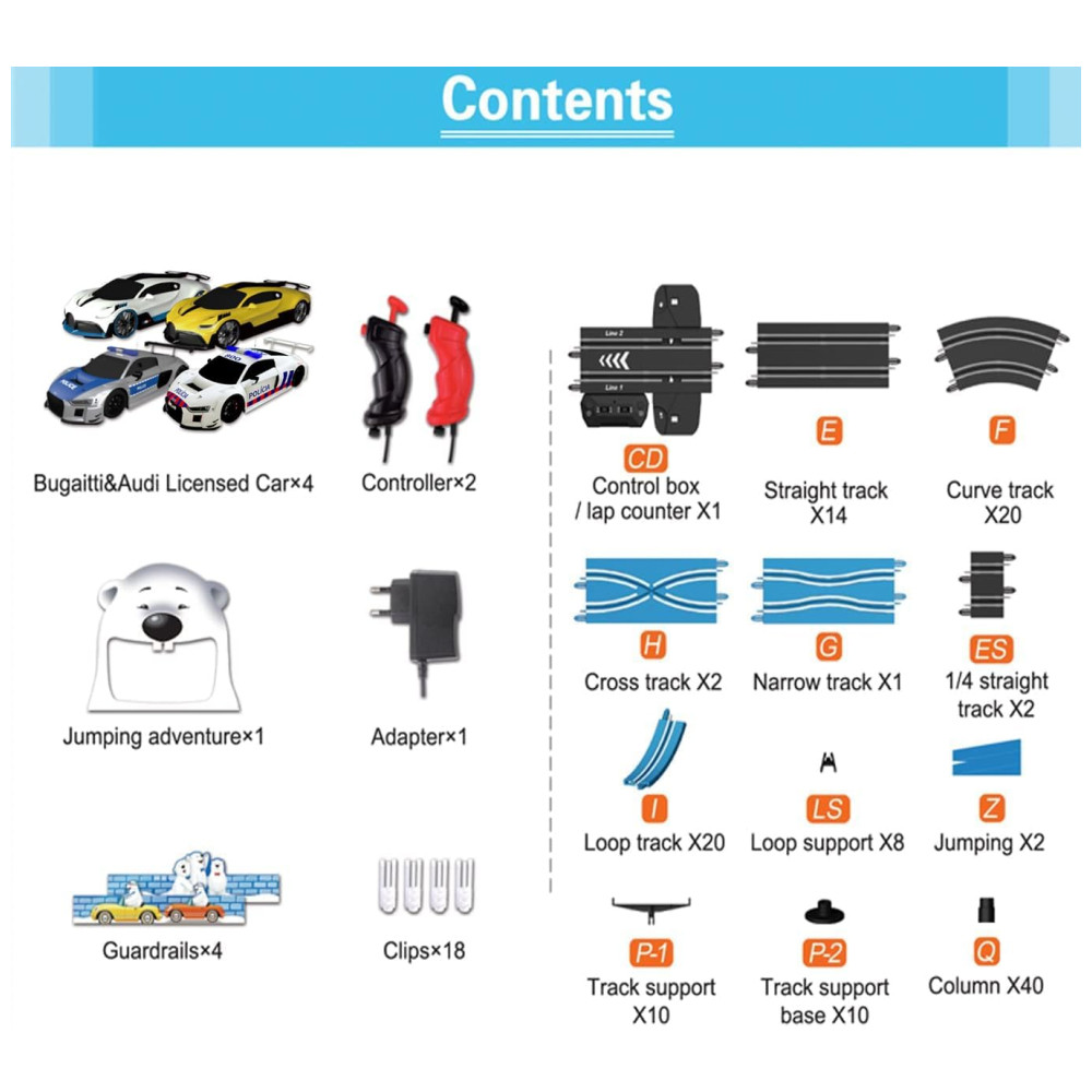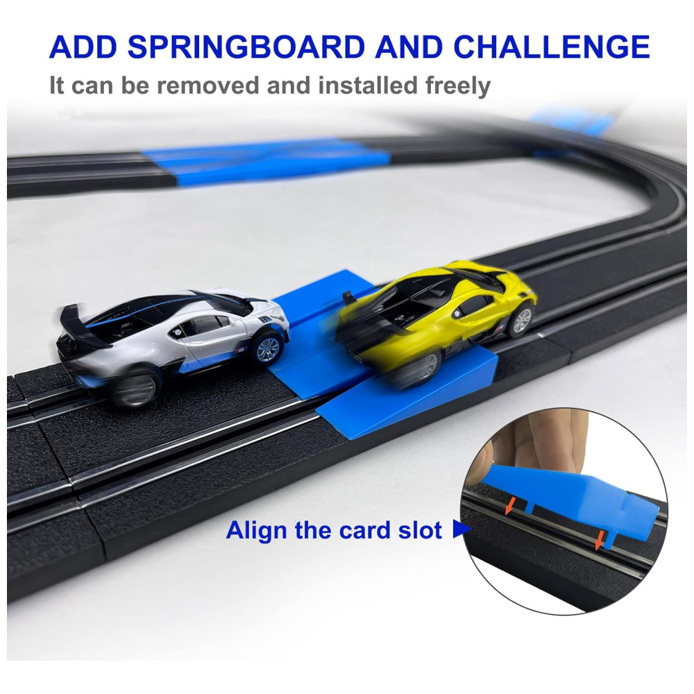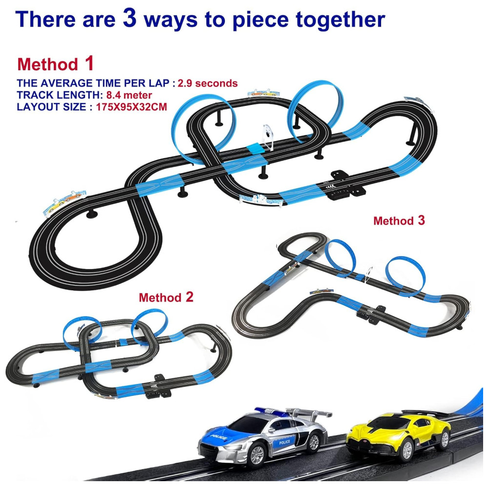 O design da pista é fácil de construir e desmontar, permitindo muitas combinações e adicionando um loop para aumentar a jogabilidade e a diversão. O layout requer um espaço razoável e possui um comprimento de pista de 8,4m.