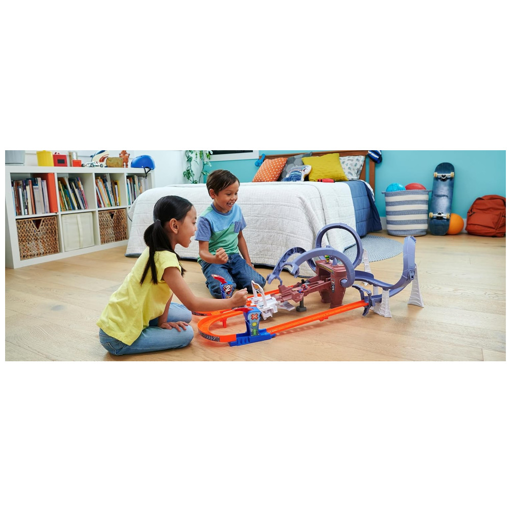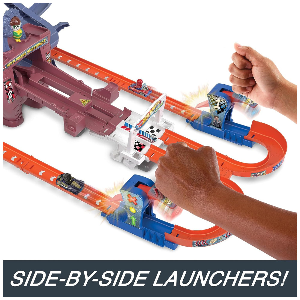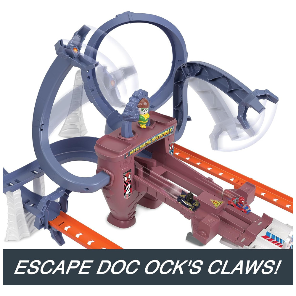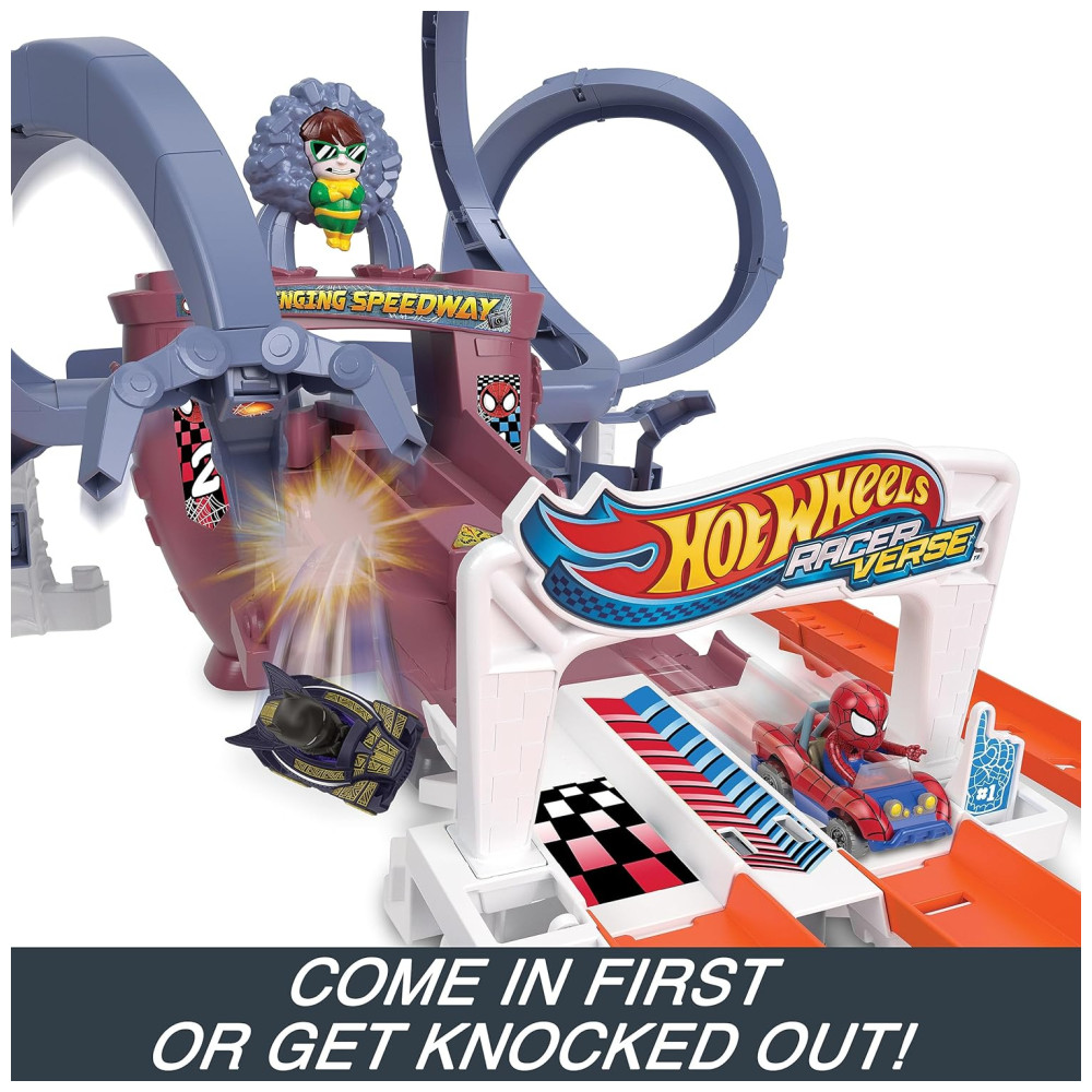 O conjunto de pistas Hot Wheels RacerVerse SpiderMan é uma emocionante corrida multivoltas entre o Homem Aranha e o Pantera Negra. As crianças podem lançar os veículos fundidos dos personagens em um loop e em torno das curvas cinco vezes. O primeiro lugar garante a vitória, enquanto o segundo colocado é derrubado da pista pelas garras móveis do vilão Doc Ock quando a ponte desaba.