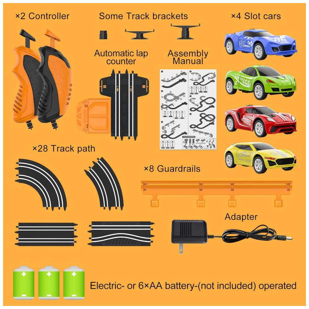 Os carros de corrida podem atingir uma velocidade alta na pista de corrida elétrica, proporcionando uma experiência emocionante de alta velocidade. O conjunto pode ser alimentado por bateria elétrica ou 6xAA não incluída , permitindo que as crianças experimentem a diversão de correr em casa ou em qualquer lugar.
