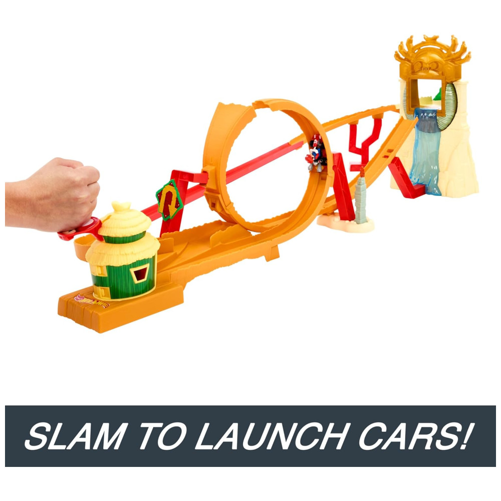 Hot Wheels Super Mario Bros. Jungle Kingdom é um conjunto de pistas de corrida inspirado no filme da Nintendo The Super Mario Bros. Com um salto em uma cachoeira, um loop quebrado e algumas curvas fechadas, este conjunto oferece muita emoção para desafiar os jogadores. O conjunto inclui um lançador que as crianças podem bater para iniciar a ação, além de um carro fundido em escala Mario 1:64 para jogar assim que sai da caixa. É um ótimo brinquedo para crianças a partir de 5 anos que amam corridas e acrobacias, especialmente fãs de Super Mario. Cores e decorações podem variar.