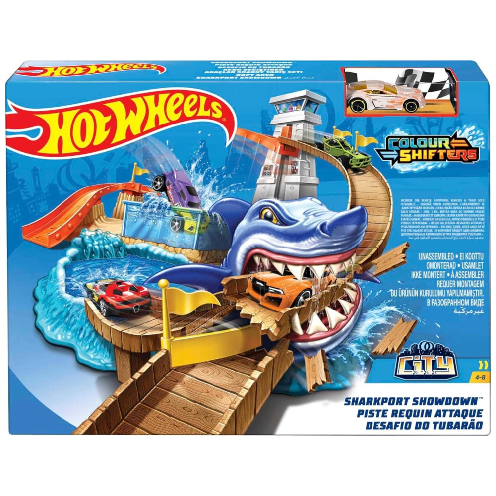 Experimente a emoção e a ação neste passeio com mudança de cor enquanto tenta escapar do tubarão gigante Carchomping. Desça a rampa da torre em alta velocidade, mas tenha cuidado para não ser pego pelo tubarão faminto por metal. Se isso acontecer, use outro veículo para acionar a alavanca de liberação e lançar o carro capturado em segurança. O conjunto Sharkport Showdown inclui um carro Color Shifters e duas zonas de mudança de cor, além de um tanque de imersão e uma piscina infantil. Este conjunto também pode ser conectado a outras pistas Hot Wheels para expandir o mundo das corridas masculinas. Adequado para crianças a partir de 4 anos.