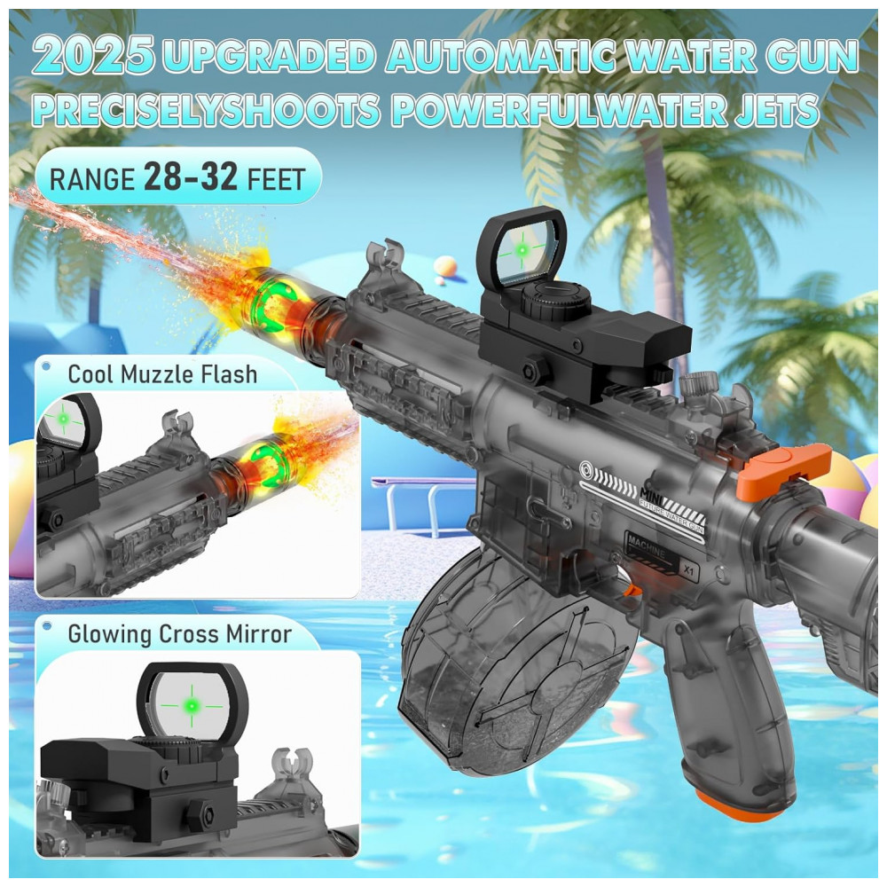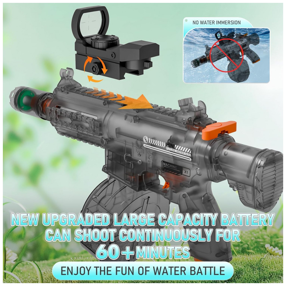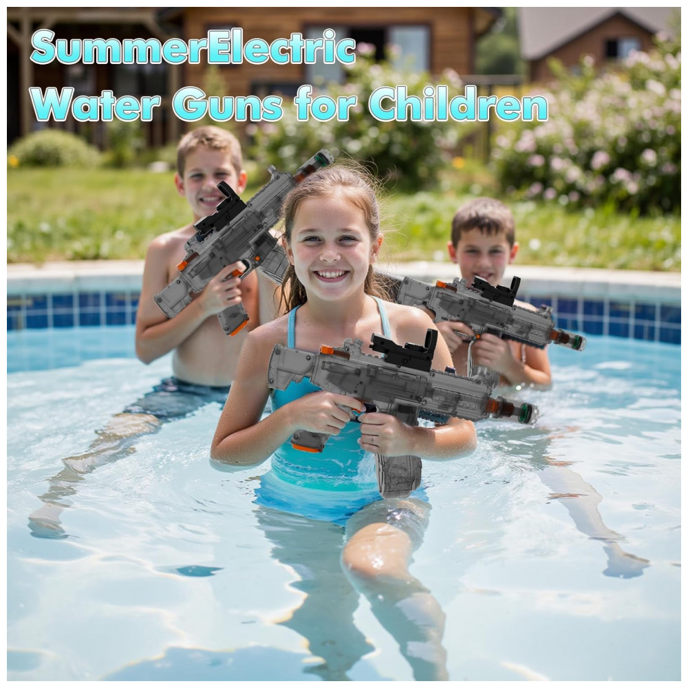 A pistola de água elétrica transparente QHECTTY foi projetada para disparo automático, combinando motor elétrico de alta potência, reservatório de grande capacidade e corpo translúcido que permite visualizar os componentes internos em funcionamento. O acionamento é totalmente motorizado, dispensando bombeamento manual, o que facilita o uso contínuo por crianças maiores e adultos em ambientes externos como quintal, praia e piscina.