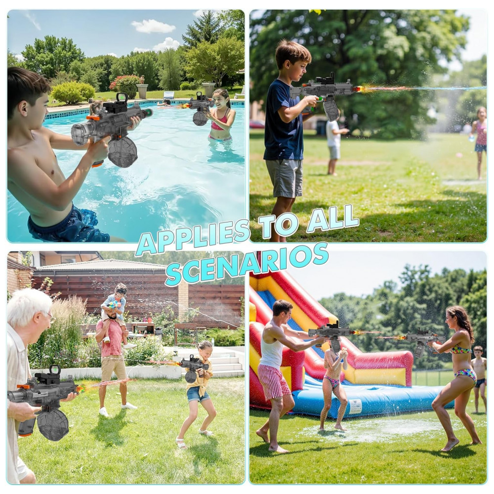 Recomenda-se o uso a partir de 8 anos, com supervisão de adulto e evitando disparos direcionados ao rosto e aos olhos. A pistola de água elétrica transparente QHECTTY preta é indicada para festas de piscina, atividades de praia e brincadeiras ao ar livre, unindo disparo automático, grande alcance e recarga prática.