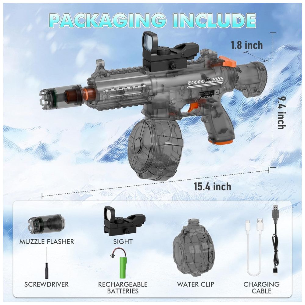 Conteúdo da embalagem: 1 pistola de água elétrica transparente QHECTTY, 1 bateria recarregável, 1 cabo de recarga USB, manual do usuário