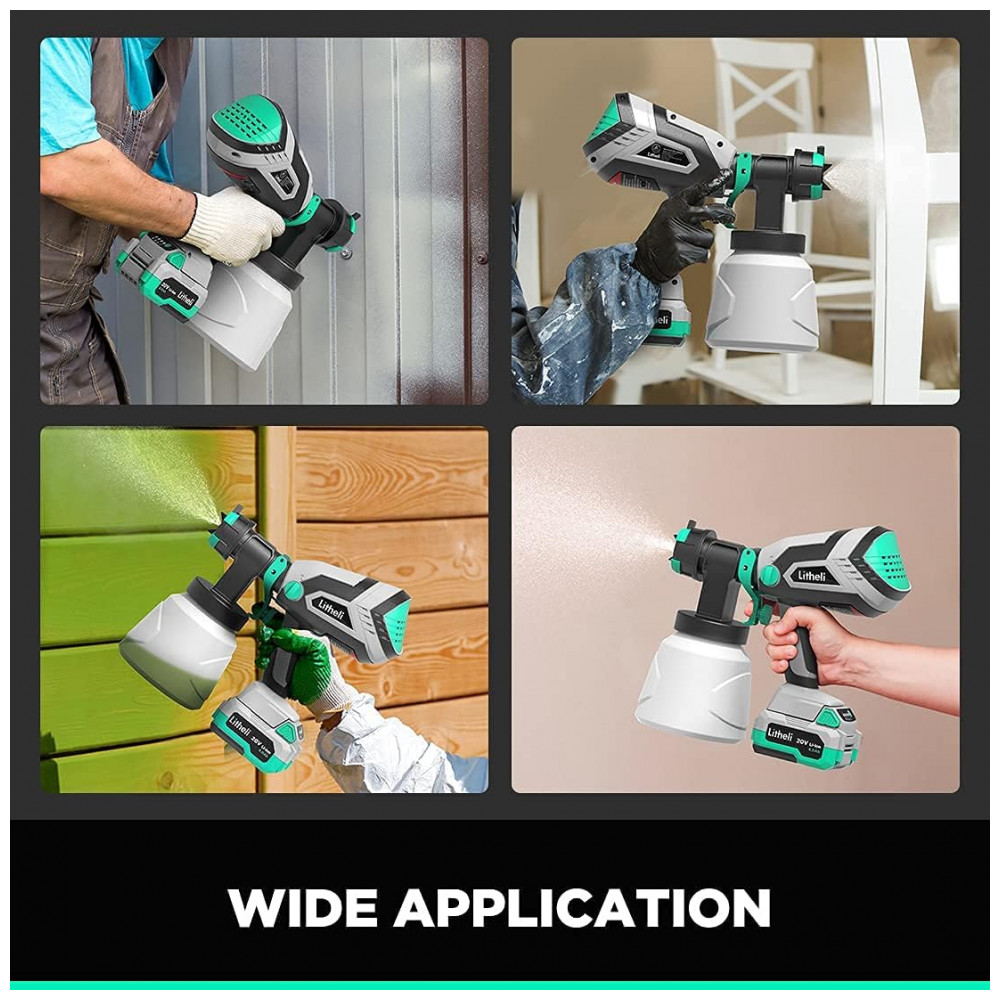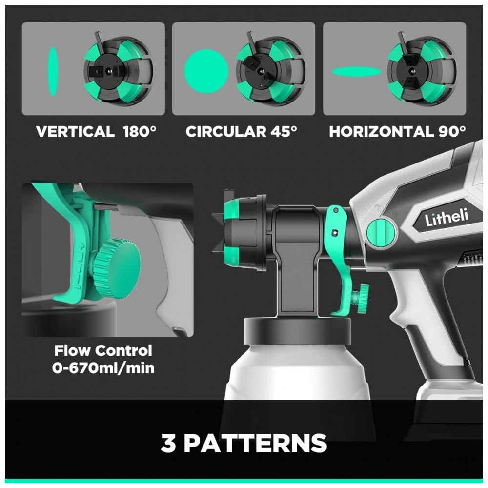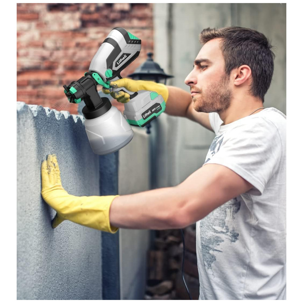 Sem fio e fácil de limpar Esta pistola de tinta spray funciona em todos os locais de trabalho, sem emaranhamento de cabos. Desmonte facilmente as peças de pulverização e o recipiente translúcido de 1000 ml para facilitar a limpeza com a agulha e a escova incluídas.