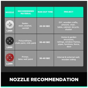 3 padrões e 3 bicos Ajuste as orelhas da capa de ar para padrões de pulverização verticais, horizontais e circulares. A pistola de pulverização vem com um bico vermelho de 2, pré instalado, com os outros dois 1,, 1, na caixa. O botão de controle de fluxo na parte traseira do gatilho gerencia a taxa de fluxo de diferentes líquidos com viscosidade 120 Din s.