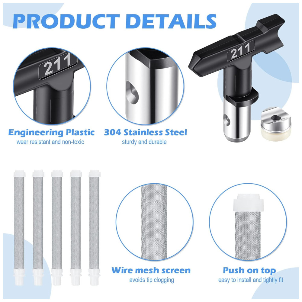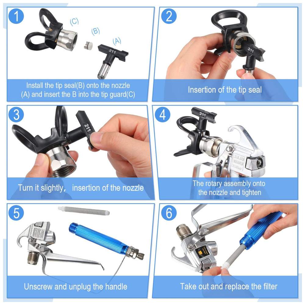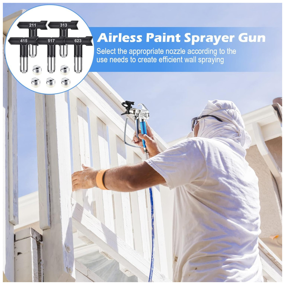 Quantidade do Pacote: O kit pistola pulverizadora airless vem com 12 peças, incluindo uma pistola pulverizadora airless, protetor de bico, 5 bicos de spray reversíveis e 5 filtros de malha para pistola airless, oferecendo material suficiente para uso diário e reposição.