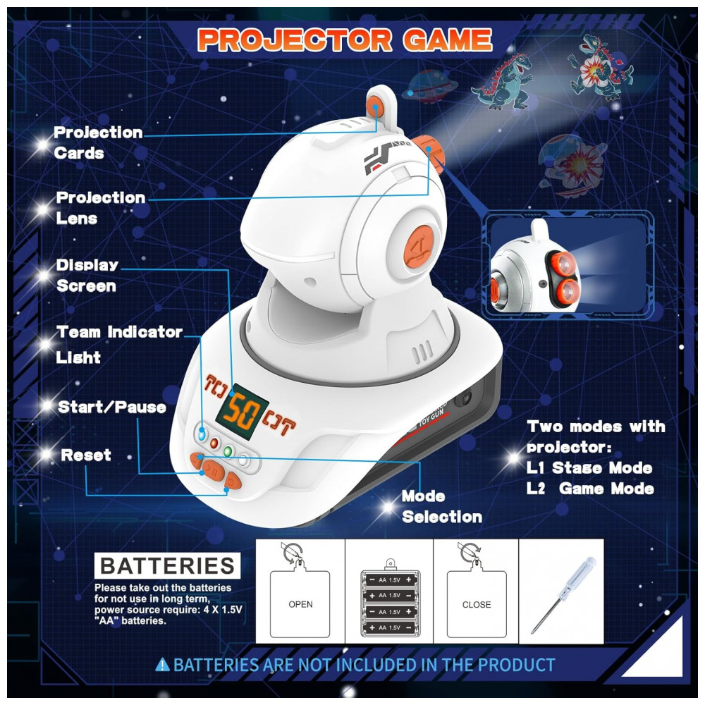 Modos Multi Play: O conjunto de laser tag tem dois modos com projetor, basta apontar o projetor em qualquer parede interna, haverá padrões claros, então aponte as s rapidamente para os padrões e atire neles, quando você acertar um padrão com sucesso, ele explodirá e cairá e você receberá a pontuação, quem obtiver mais pontuação é o vencedor. Além disso, existem jogos ao ar livre, apenas com s de laser tag, selecione o time que deseja jogar e depois atire. vamos começar o jogo lazer tag