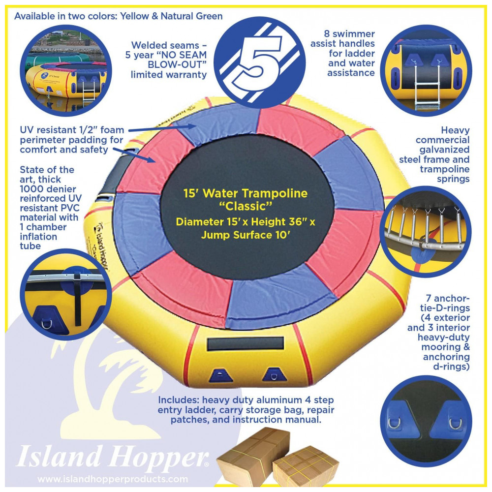 A Aqua Sports Technology projetou e construiu o trampolim aquático Island Hopper Classic usando materiais e recursos da mais alta qualidade disponíveis. Isso é para garantir maior longevidade do produto e segurança do usuário, a escolha de centenas de acampamentos e resorts em todo o mundo.