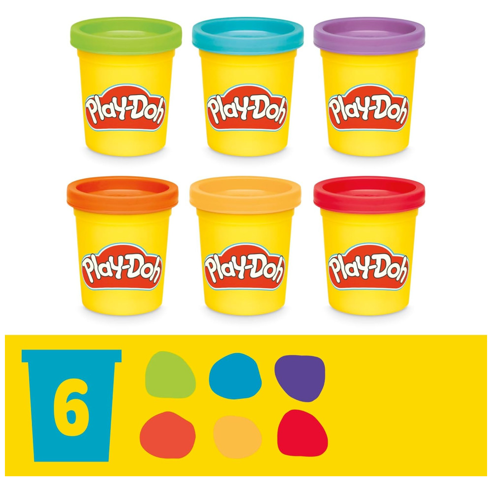 6 CORES PLAY-DOH: Latas de 57g (2 oz) nas cores verde, azul, roxo, laranja, amarelo e vermelho (contém trigo).