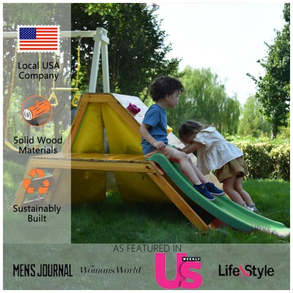 Avenlur Palm Playground 5 em 1 para Interior e Exterior: Oferece diversão no estilo Montessori Waldorf com escada de madeira, parede de escalada, escorregador de 1,2m, tenda e janelas com rede.