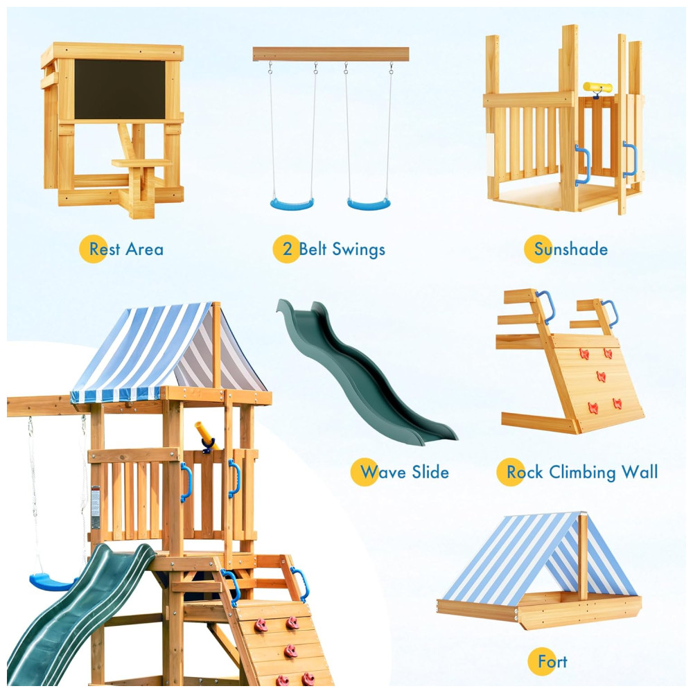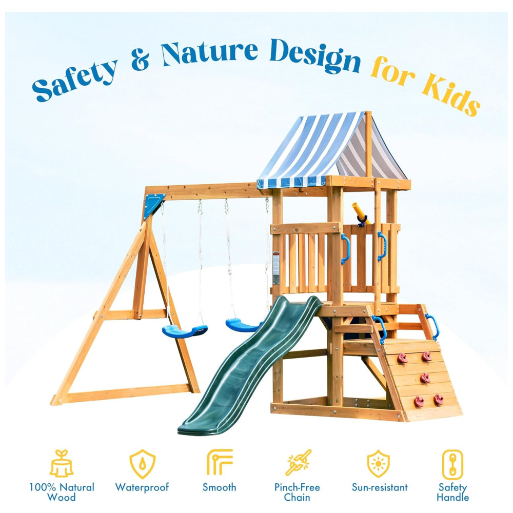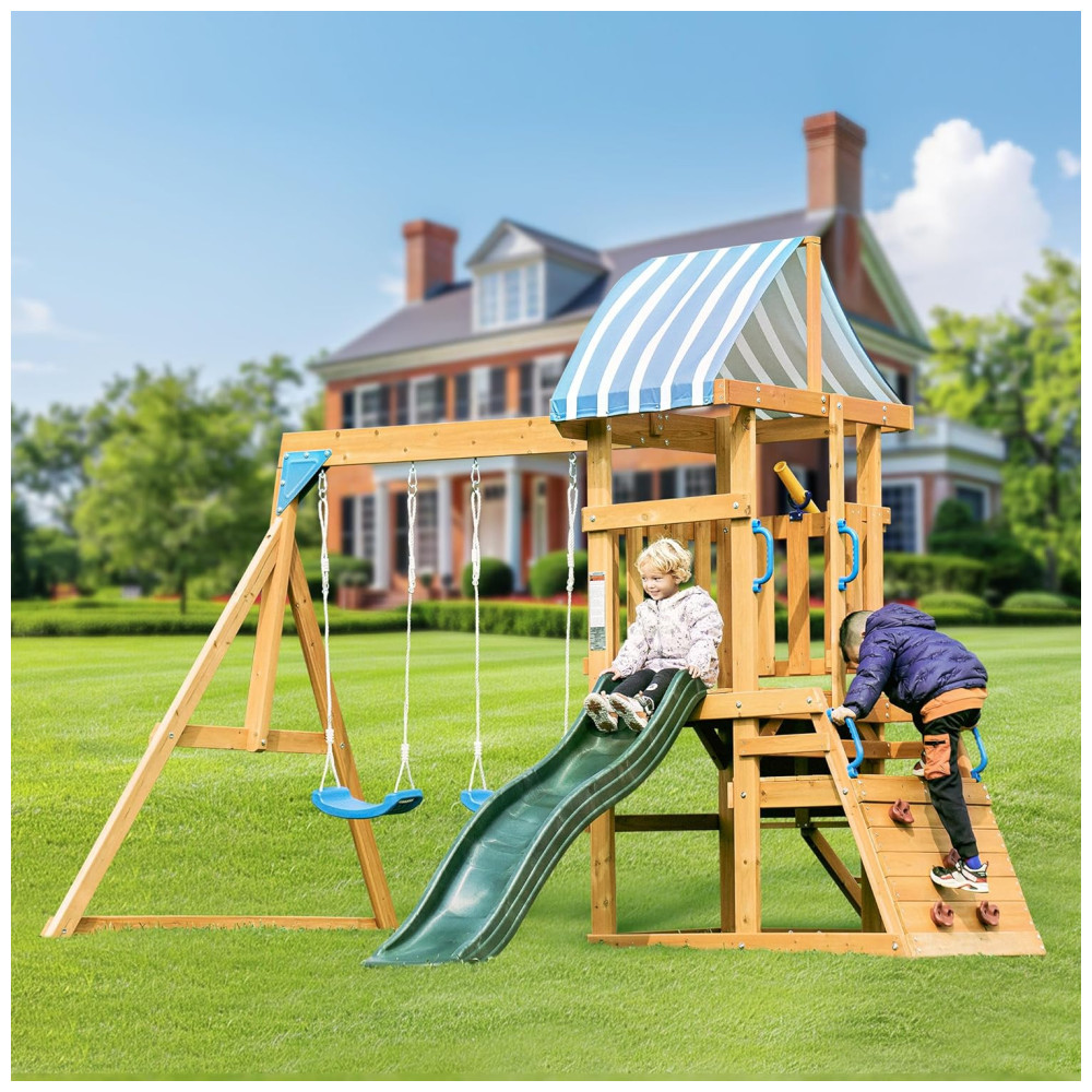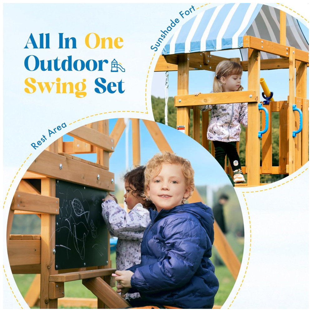 Montagem Fácil: Após a montagem (342 x 281 x 246 cm), este conjunto de balanço em madeira é fácil de montar com instruções claras, permitindo que você crie uma área de brincadeiras divertida em pouco tempo!