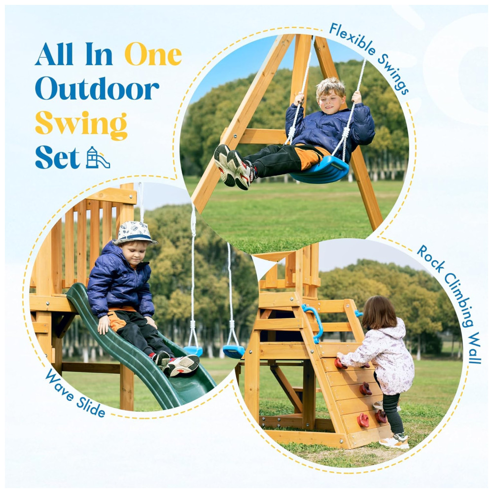 Construção Durável e Segura: Feito com madeira maciça de alta qualidade, este conjunto de balanço apresenta uma superfície lisa e livre de farpas. É robusto e estável, capaz de resistir a ventos fortes, garantindo a segurança das crianças. Com capacidade para até 6 crianças, oferece espaço suficiente para balançar, escorregar e criar memórias inesquecíveis com os amigos!