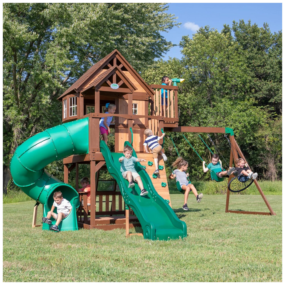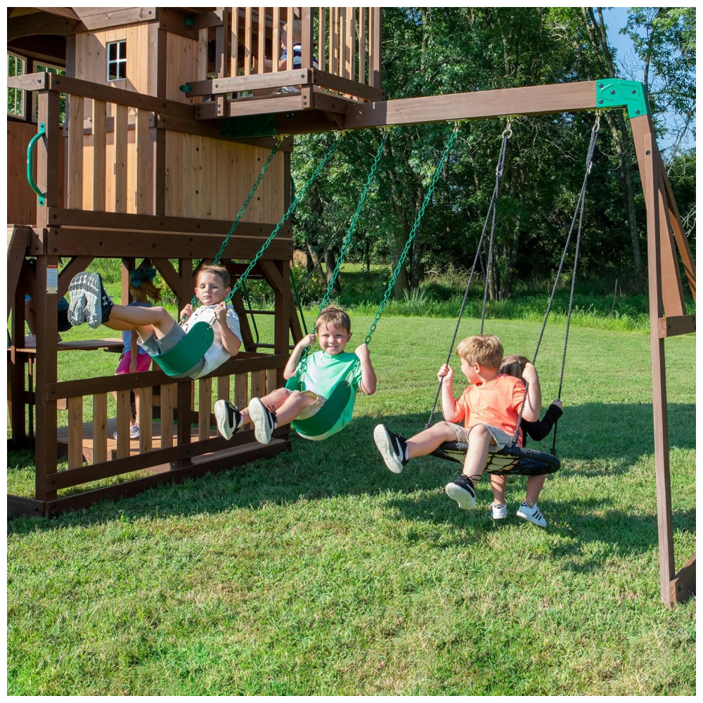 Playground infantil Backyard Discovery Skyfort em madeira de cedro com balanços escorregadores parede de escalada e área de piquenique