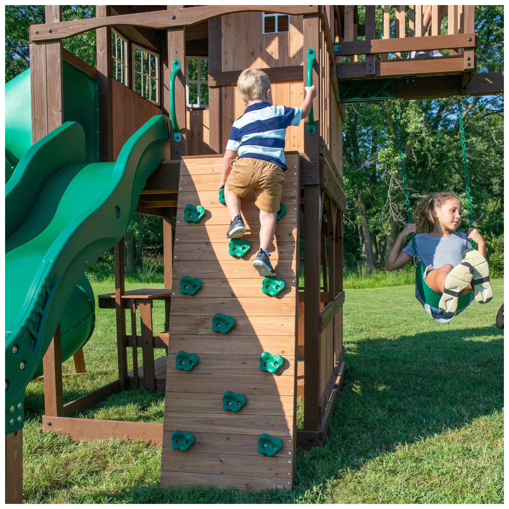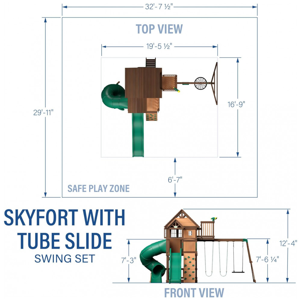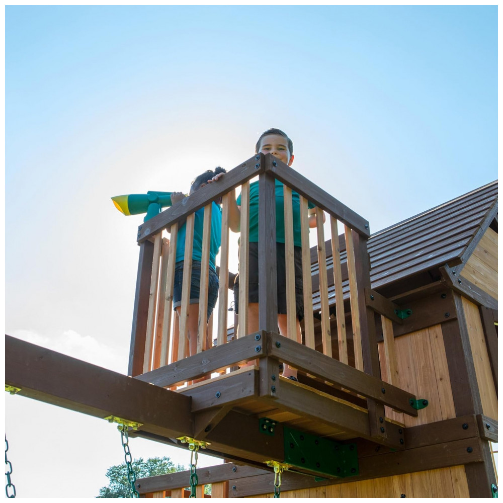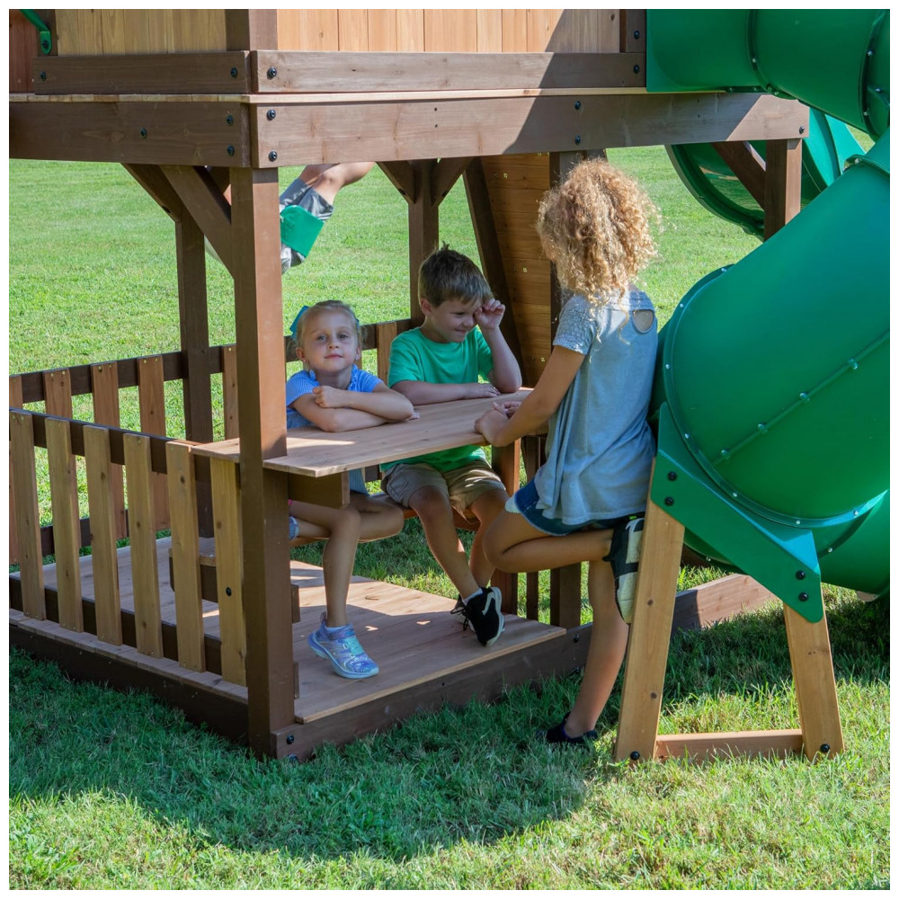 O playground Backyard Discovery Skyfort foi desenvolvido como uma estação completa de atividades ao ar livre em madeira de cedro para uso residencial. A estrutura principal inclui um clubhouse elevado com telhado de madeira coberto, janelas tipo bay window, varanda superior coberta e deck com área de observação, criando diferentes níveis de uso para crianças na faixa dos 3 aos 10 anos, conforme indicação do fabricante.