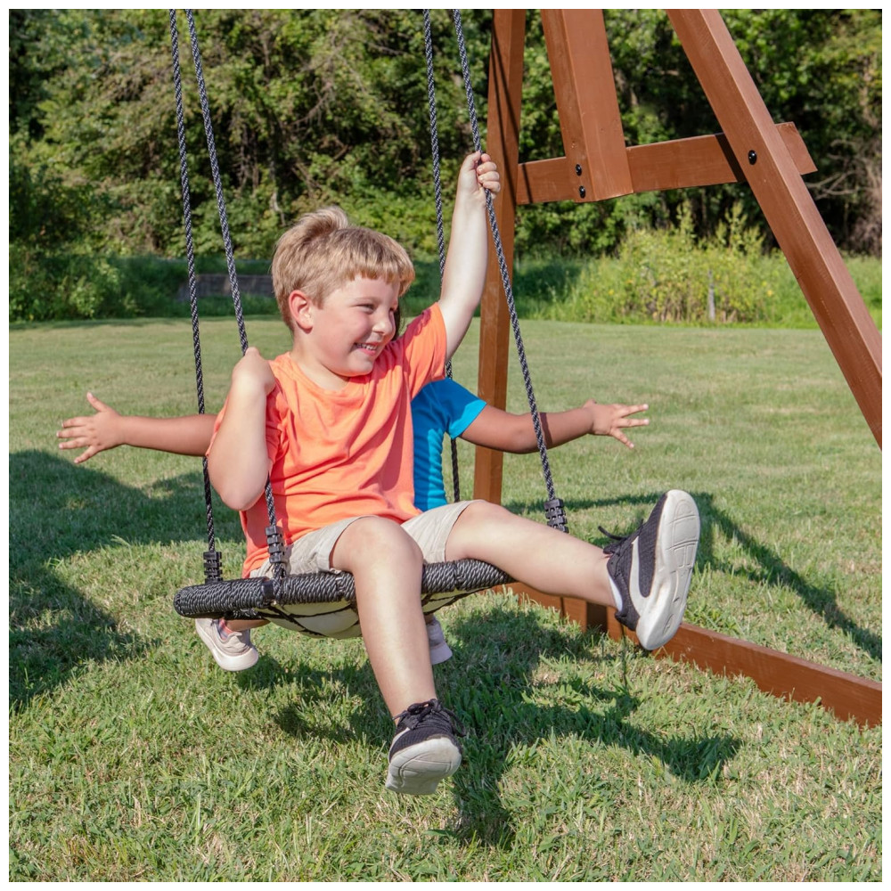 O feixe de balanços possui viga com três posições, equipada com extensor para ampliar o vão de balanço, comportando dois balanços de assento em tira e um balanço em teia. Escada de degraus planos facilita o acesso para pés menores, enquanto o conjunto é projetado para atender normas ASTM para uso residencial, dentro do limite máximo de peso combinado de aproximadamente 490kg. A montagem é obrigatória, com auxílio de aplicativo interativo em 3D compatível com dispositivos móveis, conforme instruções do fabricante.