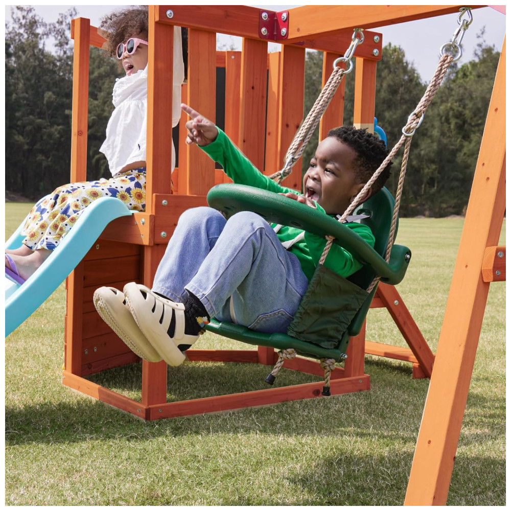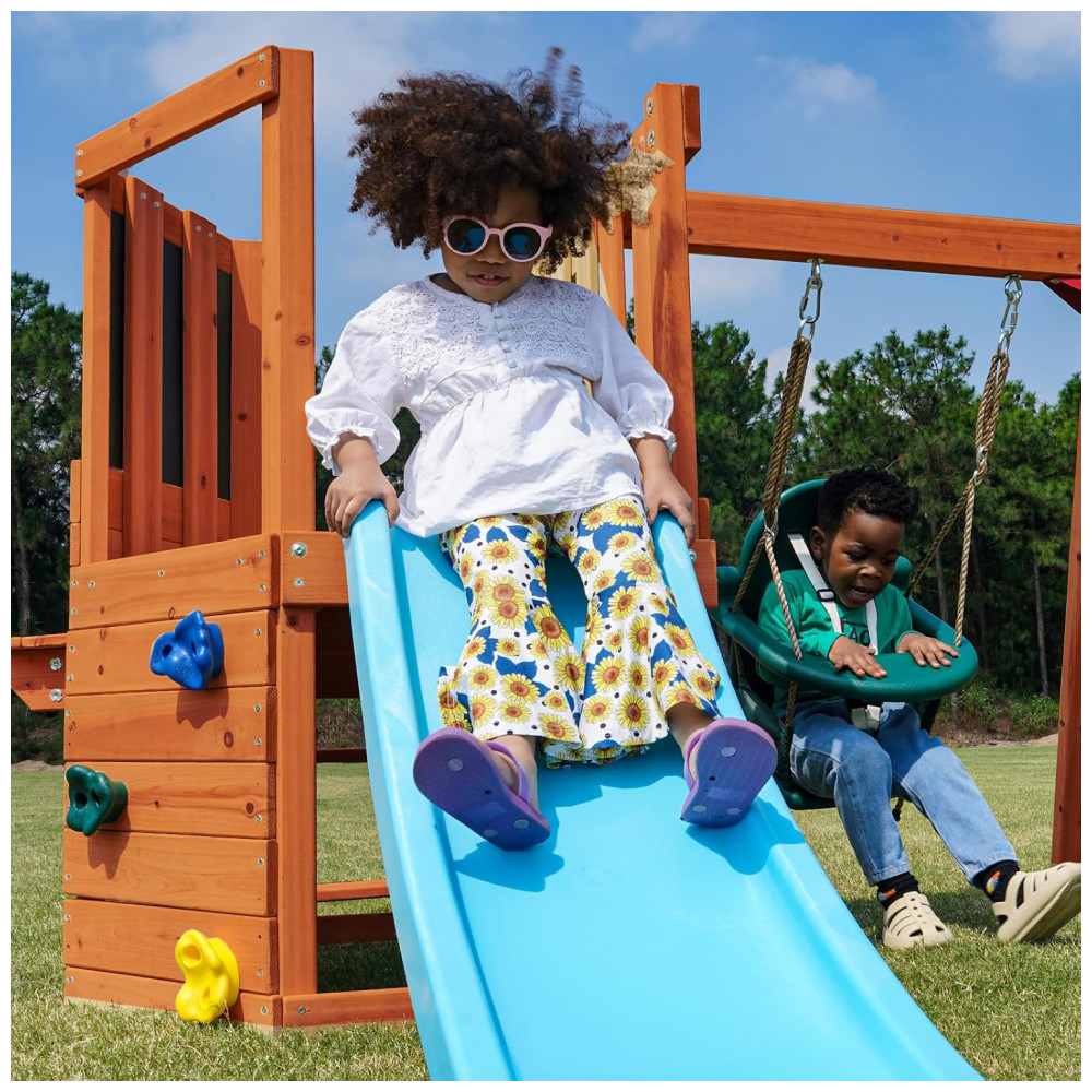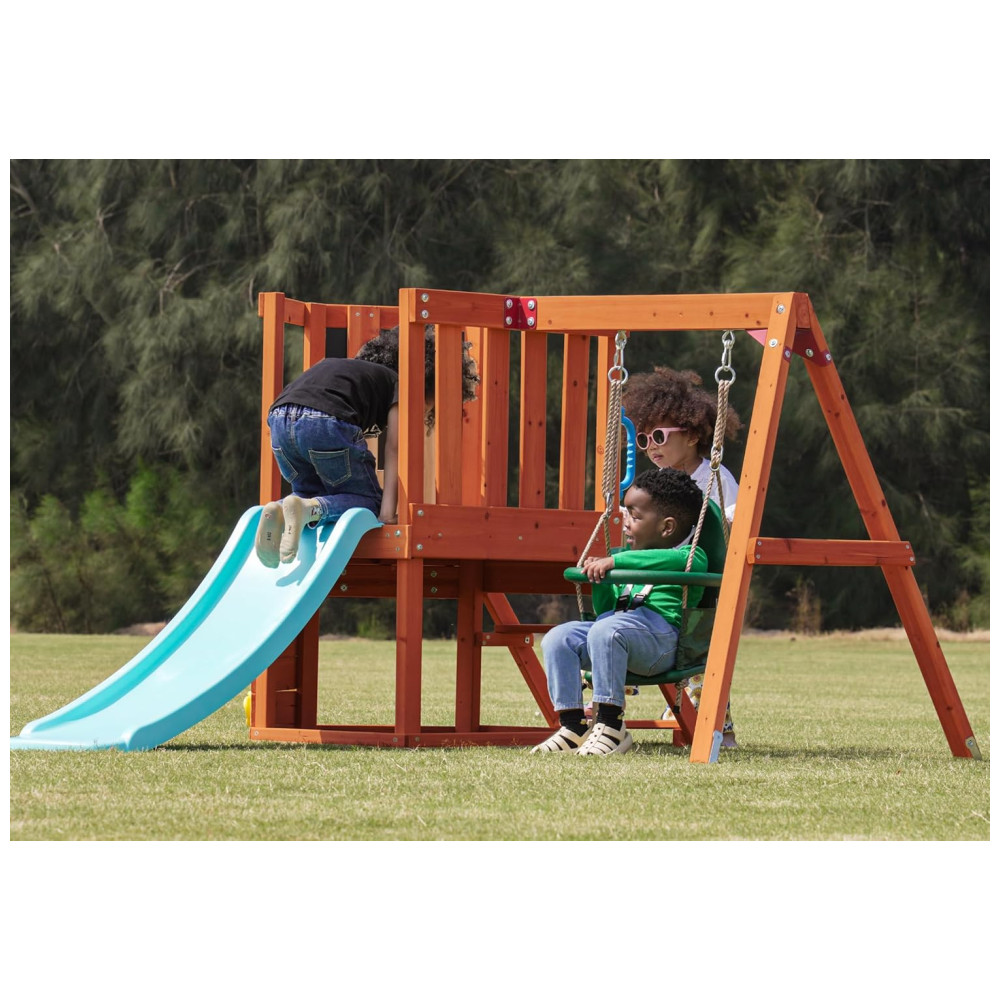 Este conjunto é perfeito para criar um espaço de brincadeiras seguro e divertido no quintal, estimulando a imaginação e o desenvolvimento motor das crianças.