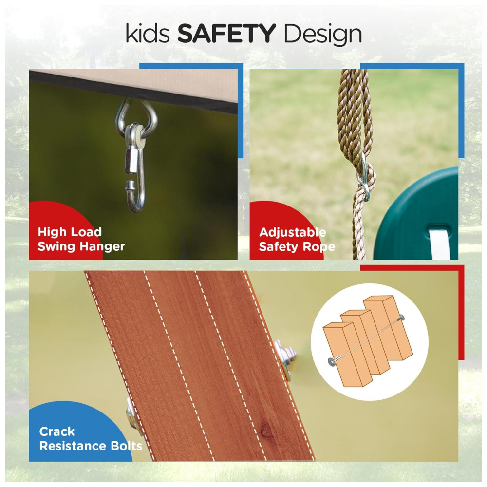Detalhes de Segurança: As cordas seguras evitam lesões nos dedos e impedem que os cabelos fiquem presos. Os suportes do balanço suportam até 200 kg. Parafusos antirachadura nas pernas em formato A evitam que a madeira quebre.