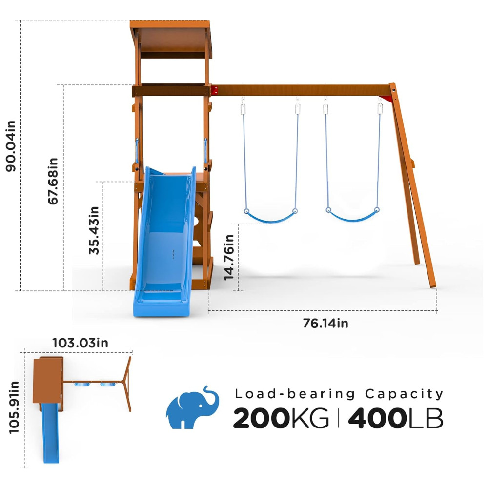 Playground Dolphin Playground T em Madeira para Quintal com Escorregador Caixa de Areia Parede de Escalada e 2 Balanços para Crianças.