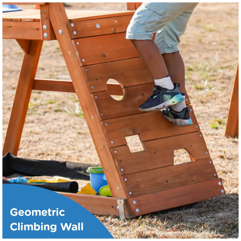 Design Único: A parede de escalada possui formato geométrico, trazendo um toque lúdico ao playground. O espaço sob a fortaleza pode ser usado como caixa de areia, proporcionando ainda mais diversão. Ideal para crianças de 2 a 6 anos, atendendo às suas necessidades básicas de brincadeira.