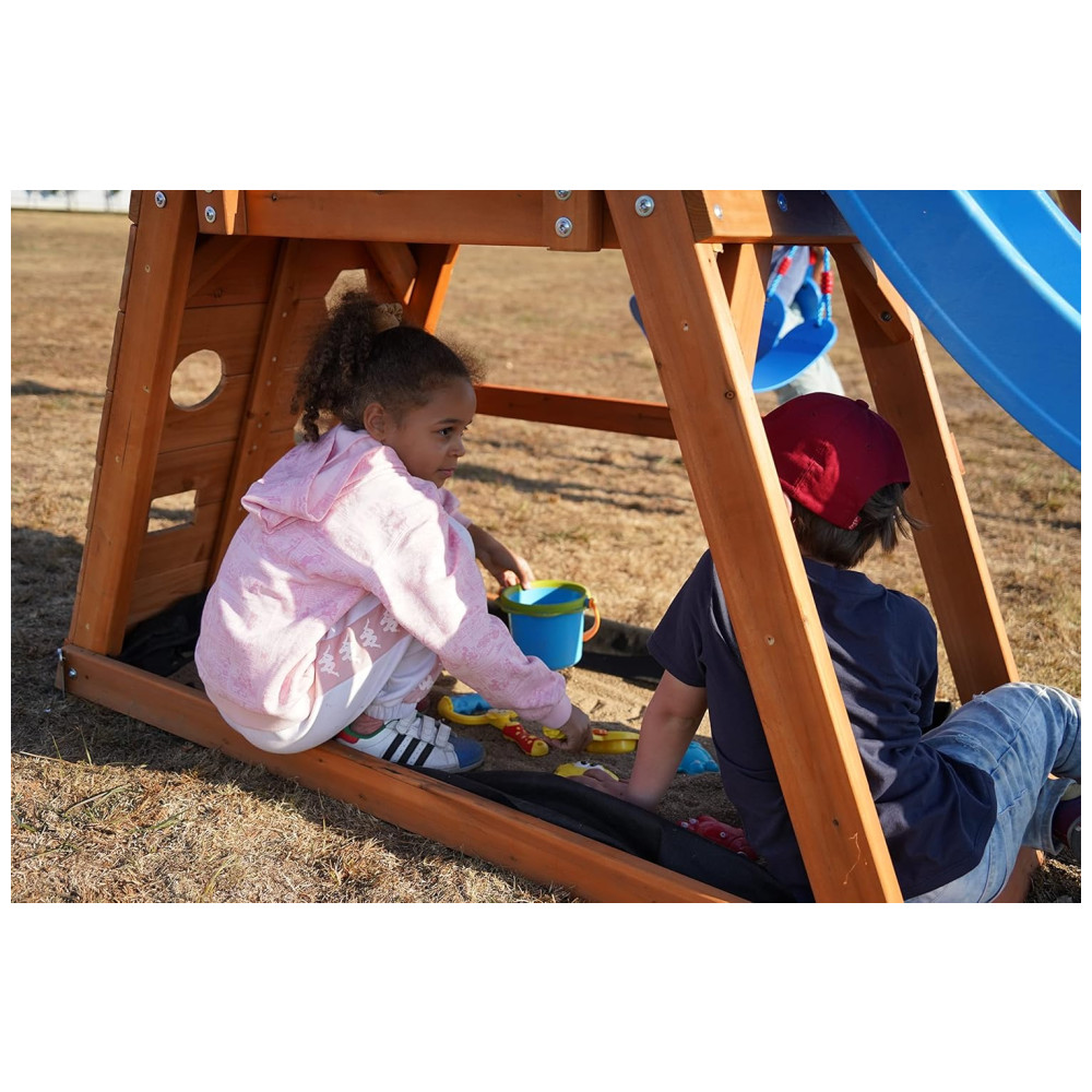 Inclui: Este conjunto conta com escorregador de 1,83 m, 2 balanços de cinto, fortaleza com toldo, parede de escalada geométrica e caixa de areia. Montado, o conjunto possui dimensões de 262 x 269 x 229 cm. Verifique se o espaço do seu quintal é adequado antes de realizar a compra.