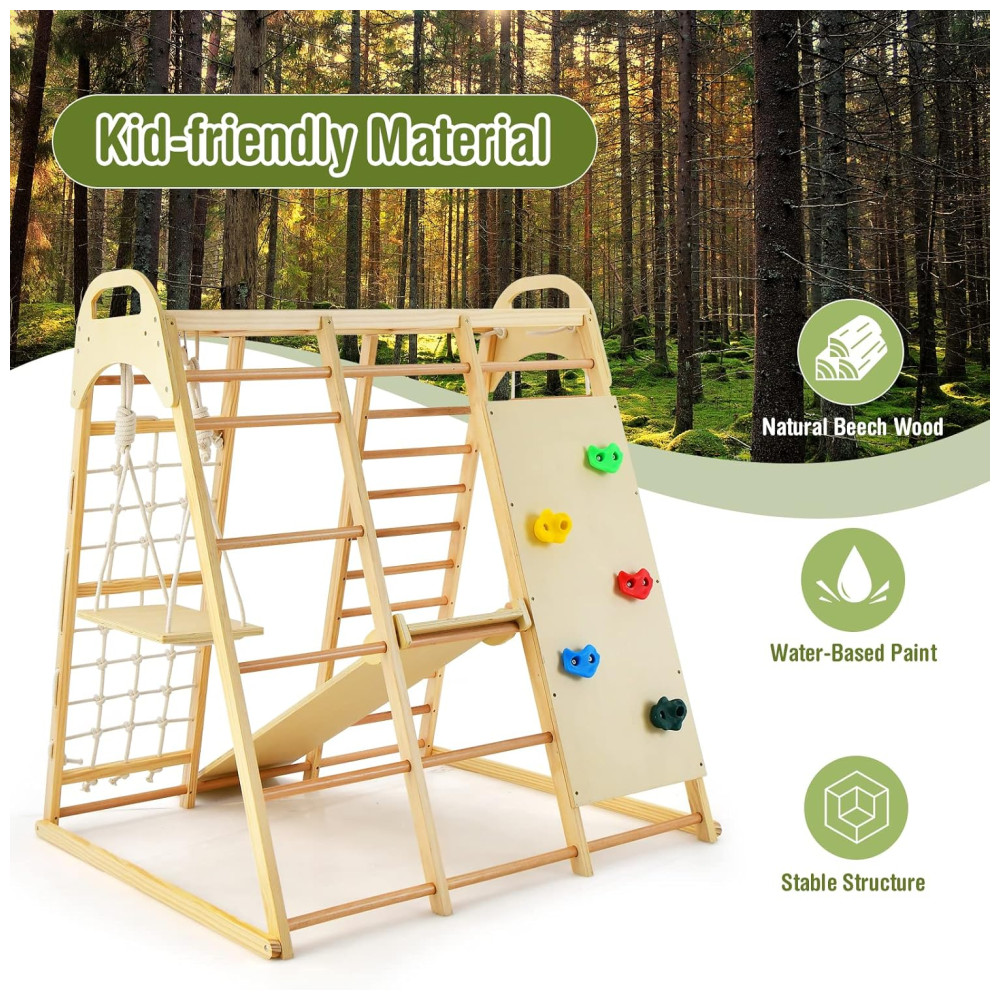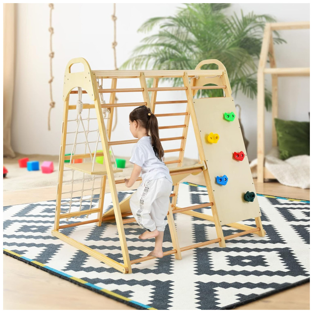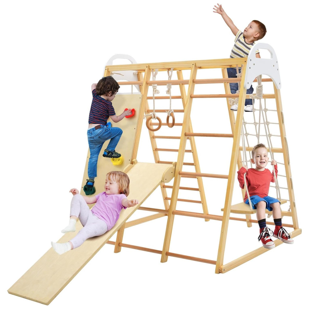 Este conjunto de brinquedos para bebês em pé e crianças é ideal para presentear seus filhos e amigos. Com escorregador reversível, balanço de madeira, barras de macaco, argolas de ginástica, rede de escalada, escada de madeira, escada de corda e rocha de escalada, as crianças podem experimentar uma variedade de esportes neste parque infantil indoor.