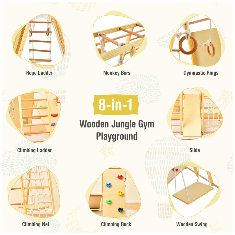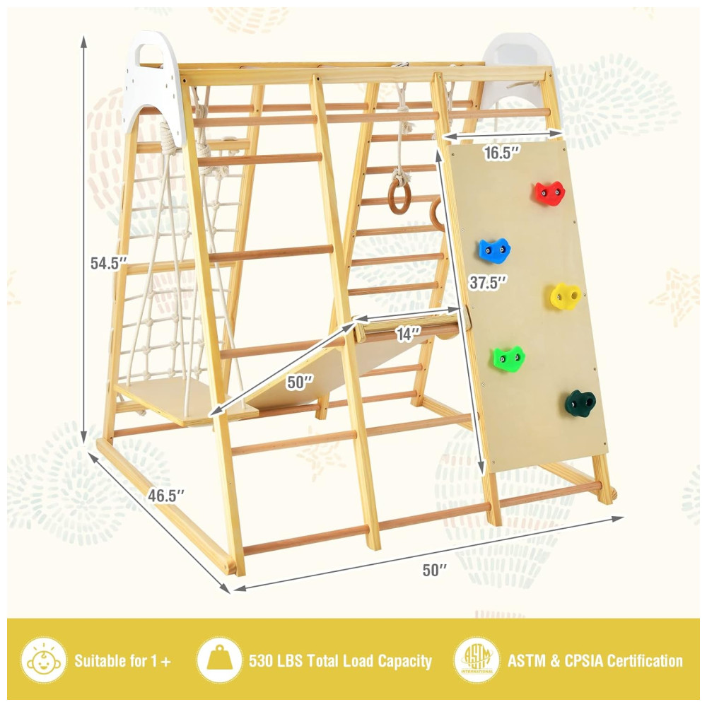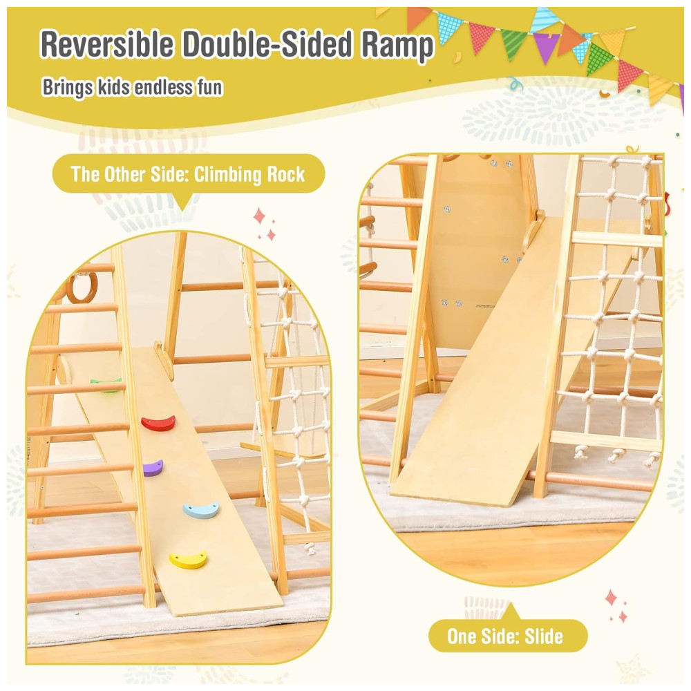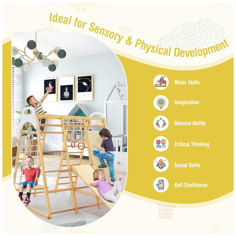 Este conjunto de brinquedos para bebês em pé e crianças é ideal para presentear seus filhos e amigos. Com escorregador reversível, balanço de madeira, barras de macaco, argolas de ginástica, rede de escalada, escada de madeira, escada de corda e rocha de escalada, as crianças podem experimentar uma variedade de esportes neste parque infantil indoor.