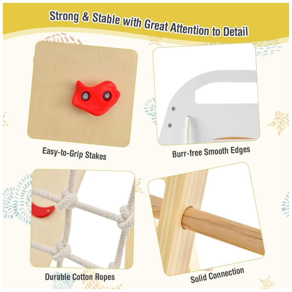 Diferente de outros conjuntos de escalada, nosso ginásio infantil indoor é feito de madeira de faia e pinho de alta qualidade, o que o torna mais resistente e estável, não sendo fácil de rachar ou desabar. Duas alças de segurança no topo facilitam o agarre das crianças durante o brincar. A superfície e as bordas são lisas sem farpas, evitando que a pele delicada das crianças seja arranhada.